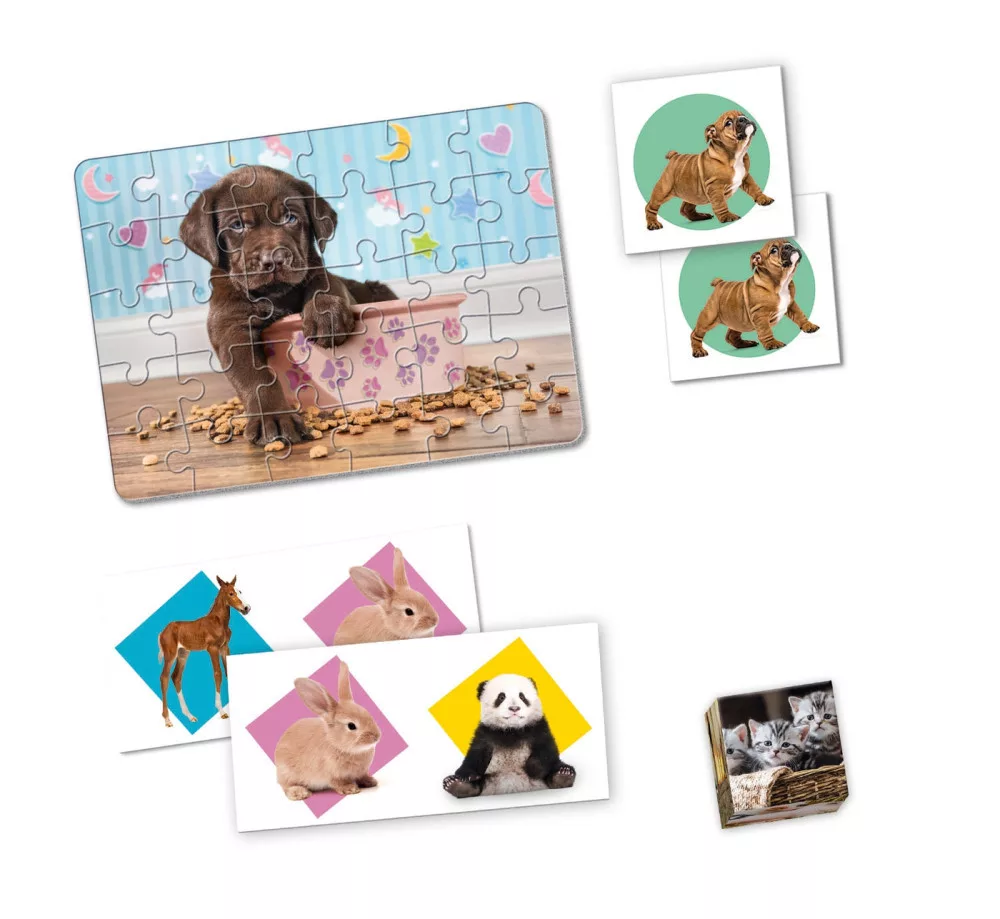 Ez a szuper Clementoni társasjáték 4 az 1-ben játék készlet, biztosan elnyeri a tetszését,minden állatbarátnak. A készletben megtalálható egy puzzle kirakó, egy dominó játék, egy memória játék és végül, de nem utolsósorban egy mesekocka játék is. A gyerekek a számukra legegyszerűbbel kezdhetik a játékot majd haladhatnak szépen sorban a legbonyolultabb felé. Jó szórakozást!