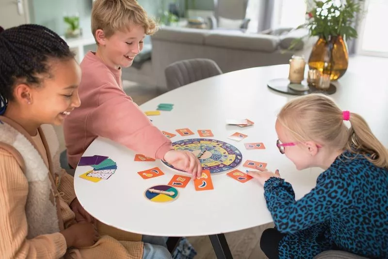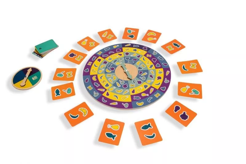 Ez egy szuper gyors játék! Te bírod tartani a tempót? Helyezzetek 14 kártyát a pörgető kerék köré, és pörgessétek meg mindkét nyilat. Nézd meg hol álltak meg, és a lehető leggyorsabban keress egy kártyát, amin 2 megeggyező kép is van, mint amire a nyilak mutatnak. A kártyák hátulján színkód található, amikért egyezés esetén extra pont jár.