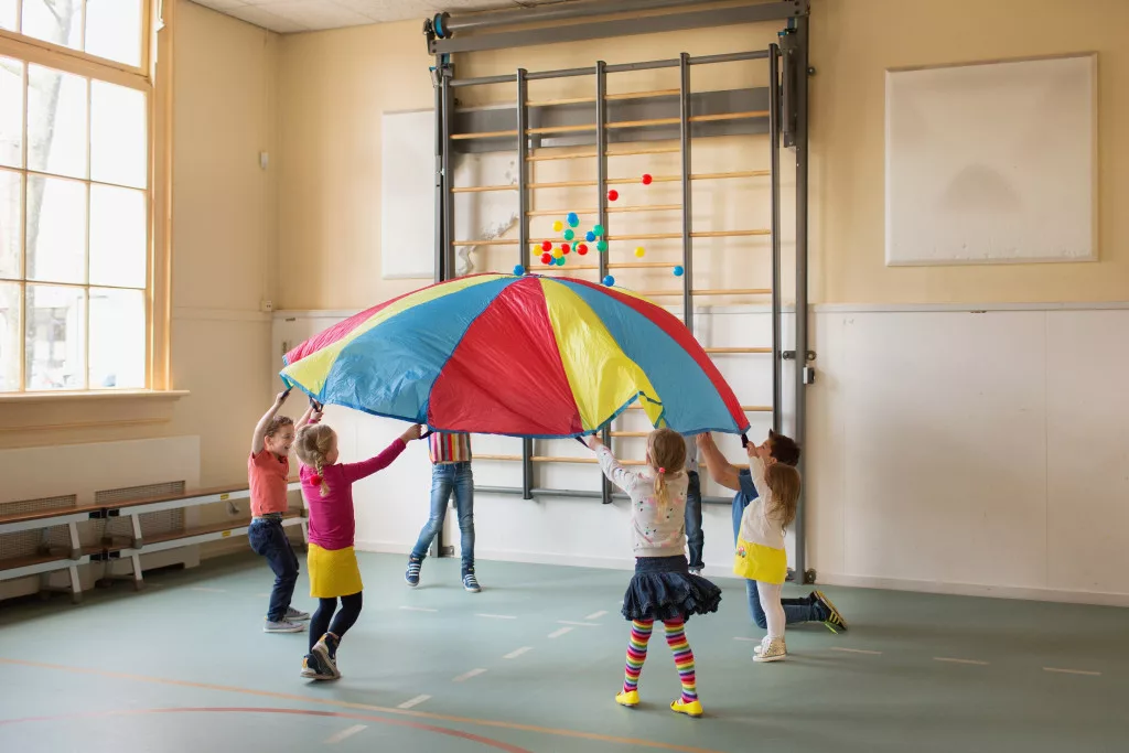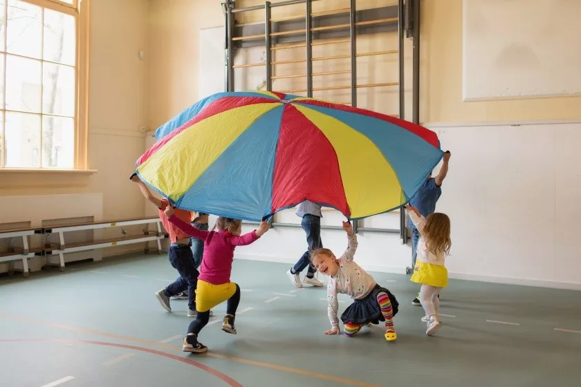 3. Játszhattok vele olyat is, hogy beszéd, verbális kommunikáció nélkül, előre megbeszélt szabály szerint fogják meg a gyerekek a színes ejtőernyőt. Ha elegen vagytok ketten-ketten is odaállhatnak egy adott színcikkhez. Akár ritmizálva is memorizálhatjátok a sorrendet. Ezután az ernyőt fektessétek a földre és távolodjatok el tőle. Egy zene mellett akár énekelhettek, körbetáncolhatjátok az ernyőt, vagy csinálhattok egészen más tevékenységet is. Ha vége, a gyerekeknek vissza kell találniuk az eredeti helyükre, vagy akár egy önként jelentkezőt is megkérhetünk, hogy rendezze vissza társait az eredeti sorrendnek megfelelően.