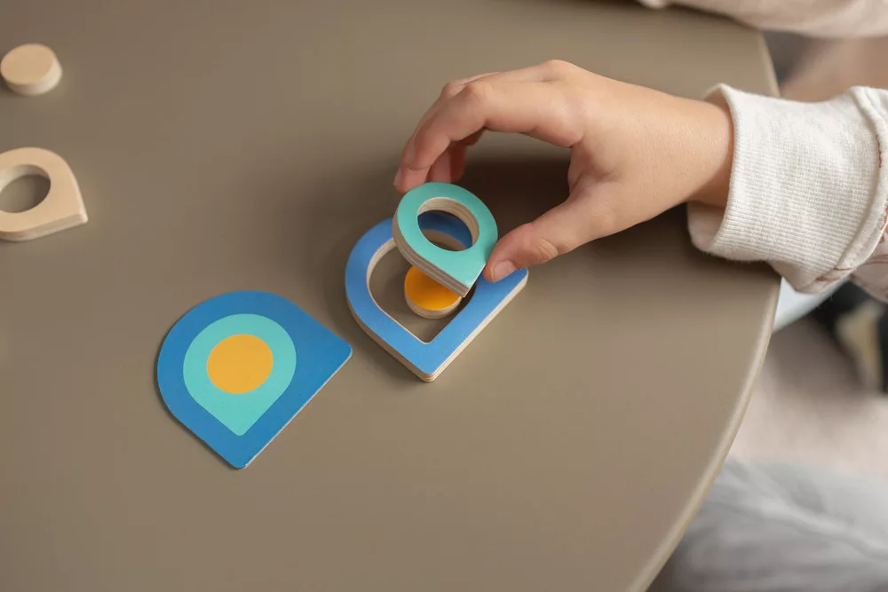 Minden játékos elvesz egy kártyát, és a kártyán szerepló formát kell kiraknunk, felváltva forgatva a fadarabokat. Próbáljatok meg emlékezni, hogy hol van az a forma és szín, amire szükségetek van, így elsőként tudjátok kiegészíteni a kártyátokat.