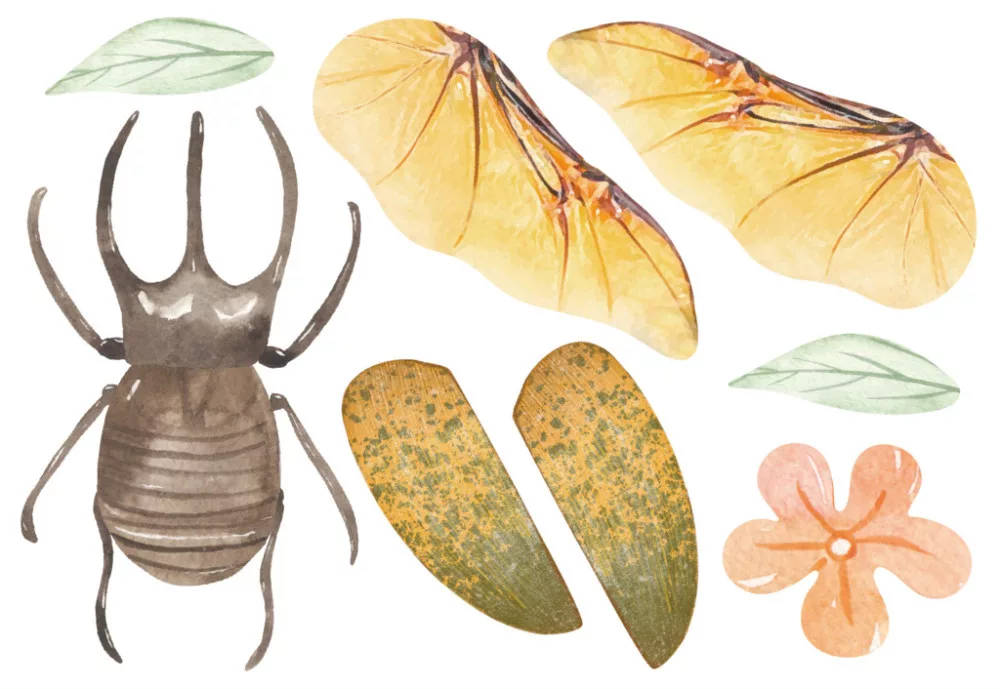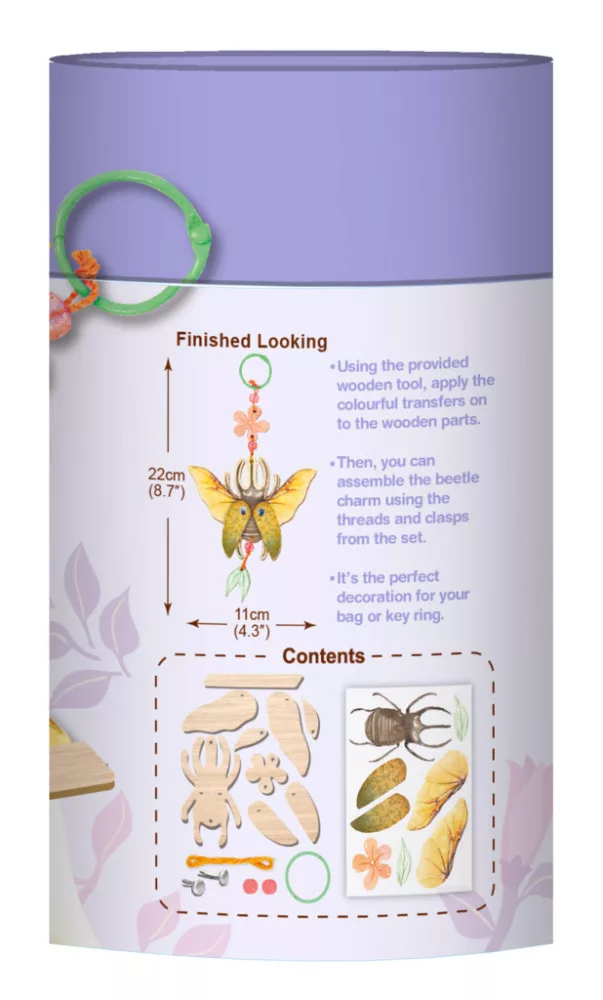 A mellékelt fa eszközzel vidd fel a színes matricákat a megfelelő elemekre, majd szereld össze a bogaras charm-ot a készletben található fonalak és kapcsok segítségével.