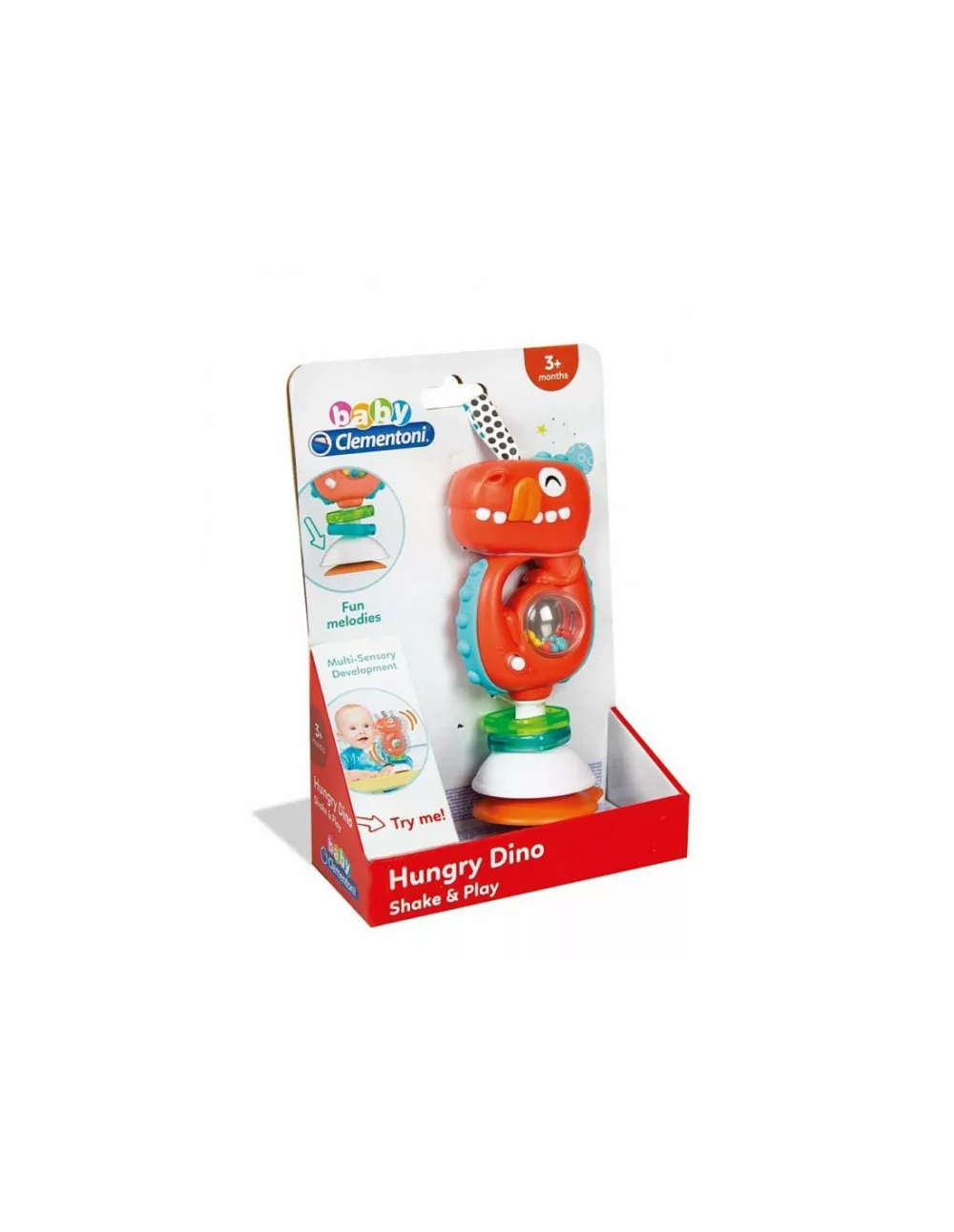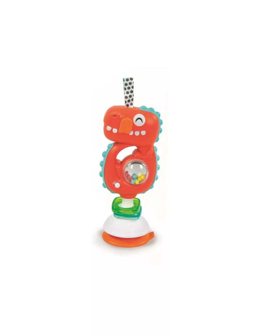 Fel van szerelve egy tapadókoronggal, mely segítségével sima felületekre könnyen feltapaszthatjuk. A dínó pocakjában színes golyók csörögnek és ezen felül, ha kisbabánk, megrázza, vidám dallamokat kezd el játszani.