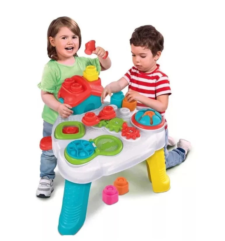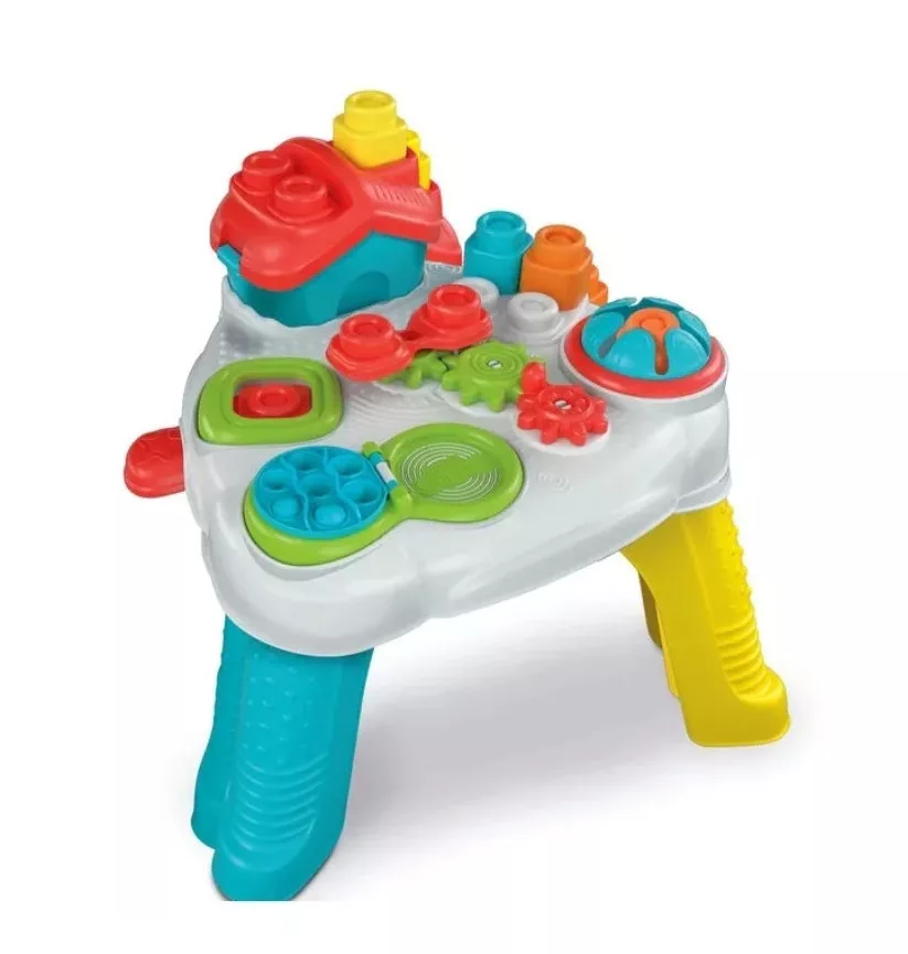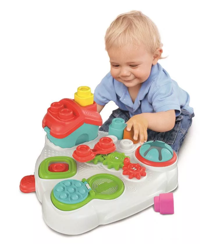 A színes formabedobó házikó segít megismerni a formákat, valamint fejleszti a finommotorikát. Az asztalba beépítésre került egy katapult, amely az építőkockákat ugrásra bírja , miközben a kerekek megpörgetik a körhintát, amelyre a blokkokat egymásra lehet helyezni.
