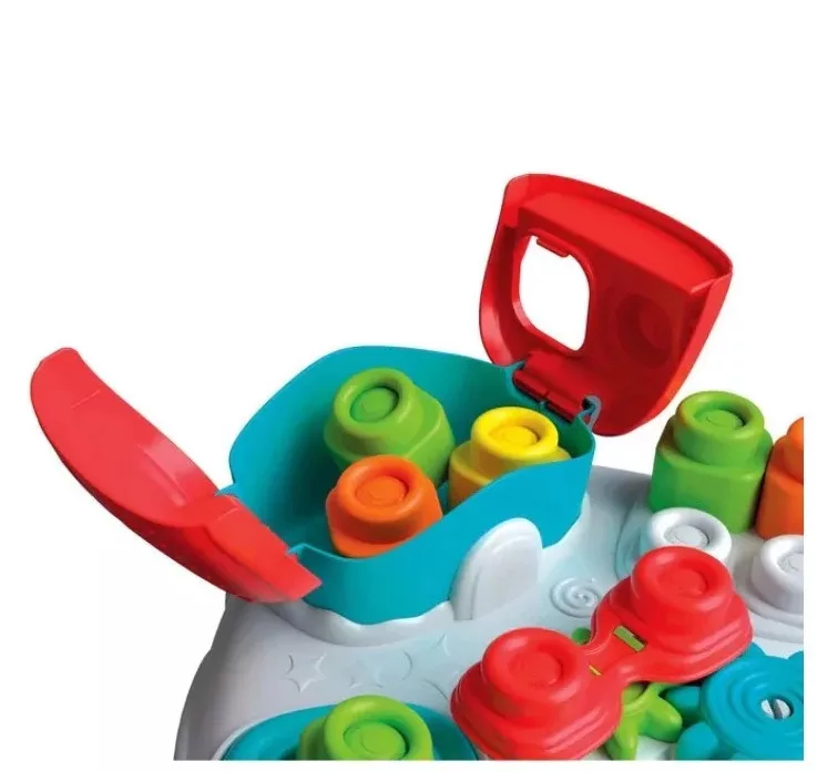 Készségfejlesztő játszó asztalka, a vidám pillanatokhoz! Az asztalban praktikus tárolóhelyek találhatók a építőkockák számára, és a tetőn lévő lyuk ideális azok behelyezésére.