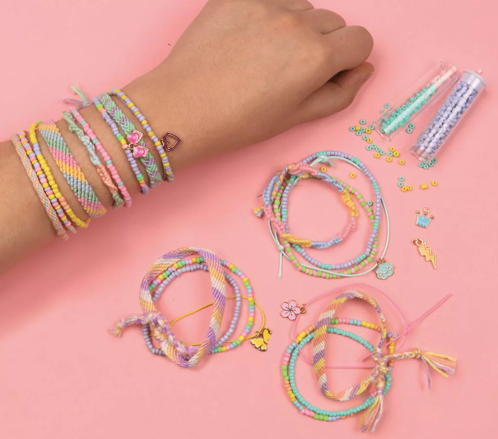 30 karkötő elkészítéséhez szükséges anyagok, amelyeket kedved szerint kombinálhatsz: gyöngyök, brazil fonalak, rugalmas fonalak és színes medálok, hogy valóban megtaláld a kedvedre valót. Az egyszerű és divatos kreációk szivárványhatást keltenek a csuklón.