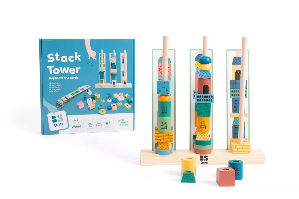 A BS Toys fejlesztő fajátékaival garantáltan jól fognak szórakozni a gyerkőcök! Ebben a játékban egy-egy tornyot kell felépíteniük 12 db minta kártyának megfelelően. A farúdak mögé felállítjuk a kártyákat, majd a gyermeknek meg kell keresnie melyik elemet kell használnia és hova kerül a sorrendben. Miután kész a torony gyakorolhatjuk a színek, formák és minták megnevezését. Kiváló lehetőség a forma- és színfelismerés játékos fejlesztésére. Ahogy a kis kezek megragadják a kicsi, színes elemeket és egyesével felhúzzák őket a farudacskákra fejlődik a finommotorikájuk és szem-kéz koordinációjuk. Ha már unalmasak az előre legyártott sablonok találhatunk ki a gyermeknek sajátot, vagy akár ő is rajzolhat újakat. A minőségi fakockák építésre ösztönzik a gyerkőcöket.