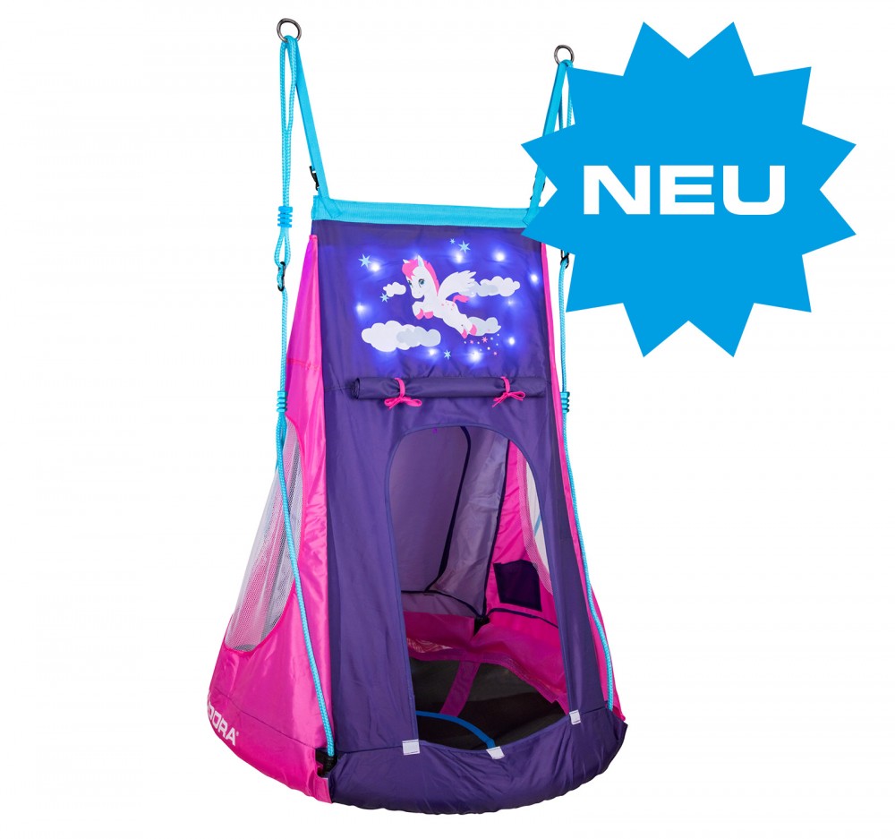 A gyerkek többsége szívesen játszik sátorban. A sátorral kiegészített fészekhinta ezt az élményt fokozza azzal, hogy játék közben a gyerekek lebeghetnek is. A külön bekapcsolható belső LED-se világítás a sátort még izgalmasabbá teszi. A sátor oldalain szellőző ablakok találhatóak.