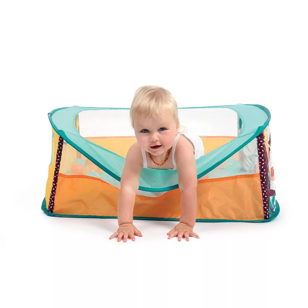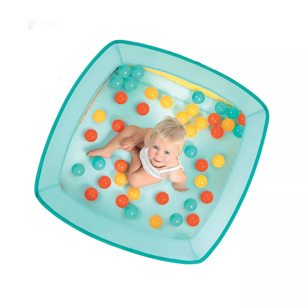 Ebben a puha falú labdamedencében a babád szabadon játszhat a 40 színes labdával és a kedvenc játékaival. A medence három lyukon keresztül a labdák ki- és bedobása is lehetséges, ami remek móka lesz a kicsiknek.