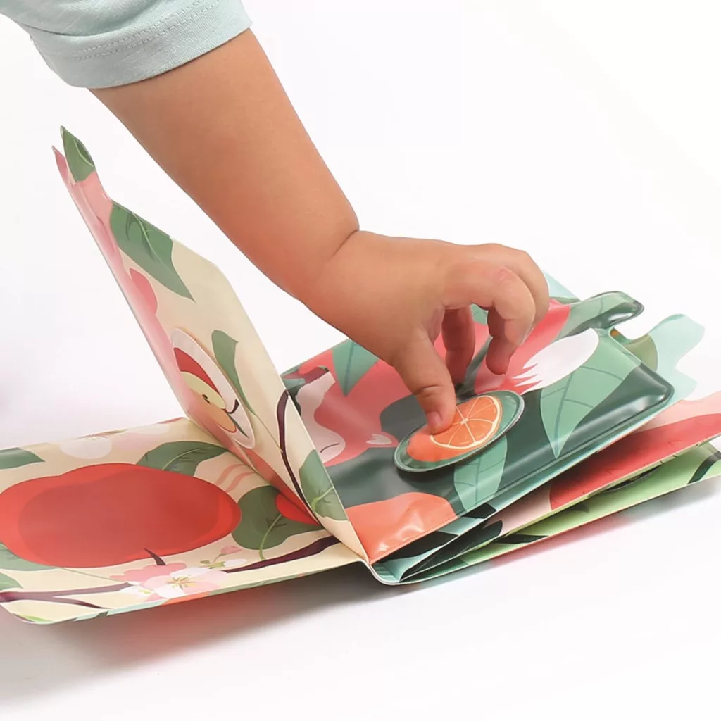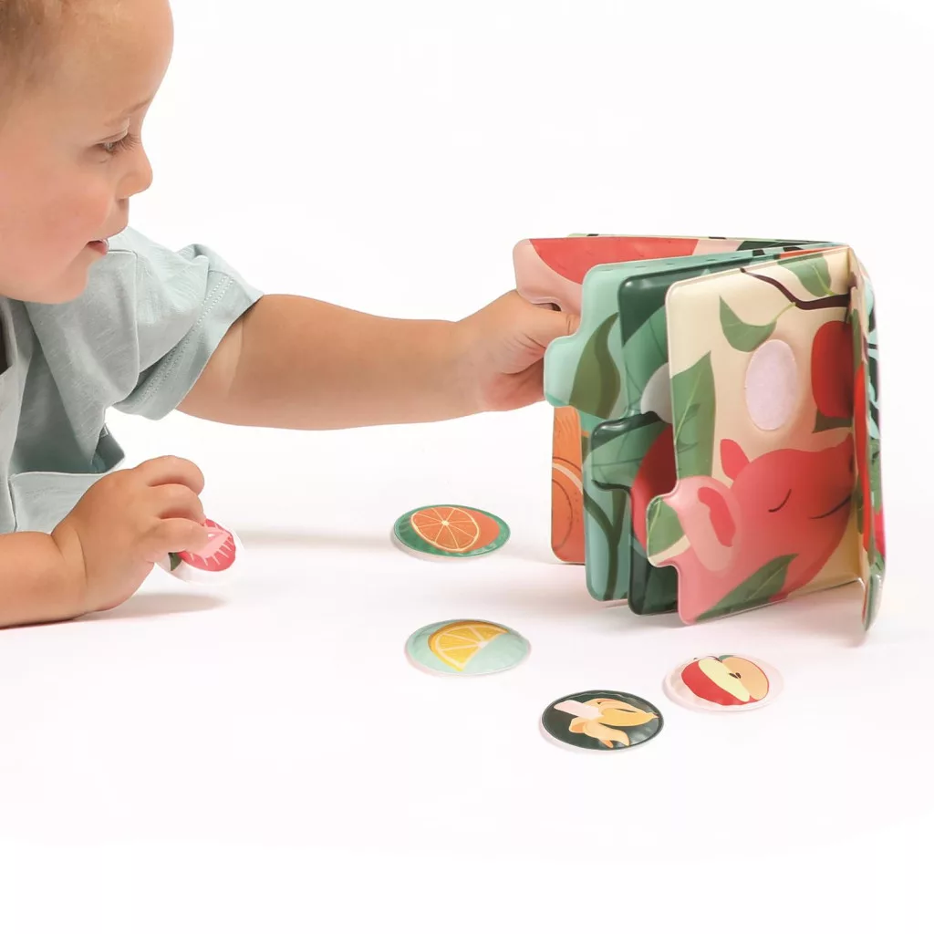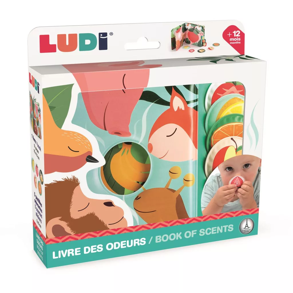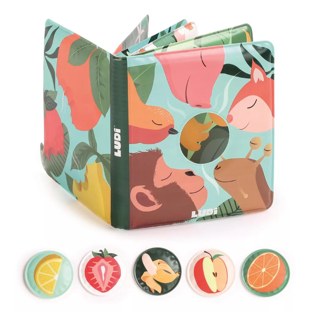Egyedülálló lapozó a LUDI márkától. Gyermekünk a könyv segítségével, megismerheti az állatokat és azok kedvenc gyümölcsét. Nem csak színpompás, de még illatos is. A könyvhöz tartozó kis gyümölcsszeleteket ábrázoló korongok megdörzsölve illatosak. Ezeket a korongokat tépőzár segítségével az adott állathoz tudjuk párosítani.