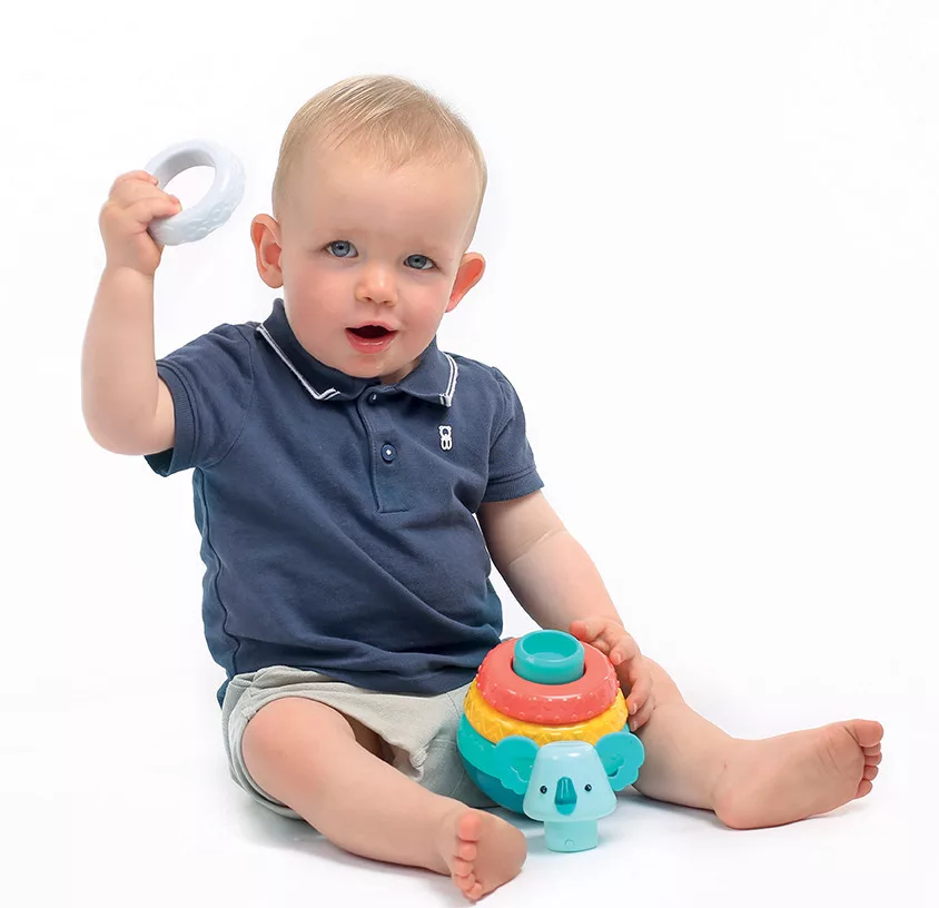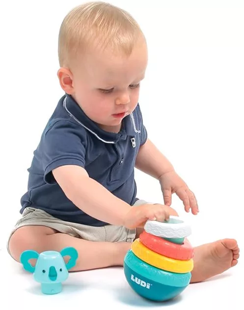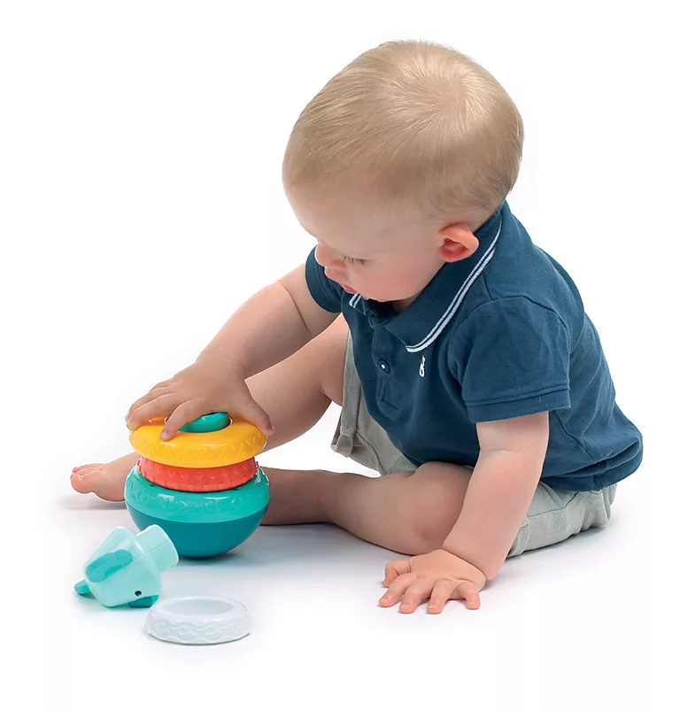 Figyeld, ahogy gyermeked önfeledten forgatja, építi és bontja a tornyot – közben együtt fedezitek fel a formák, színek és hangok világát.