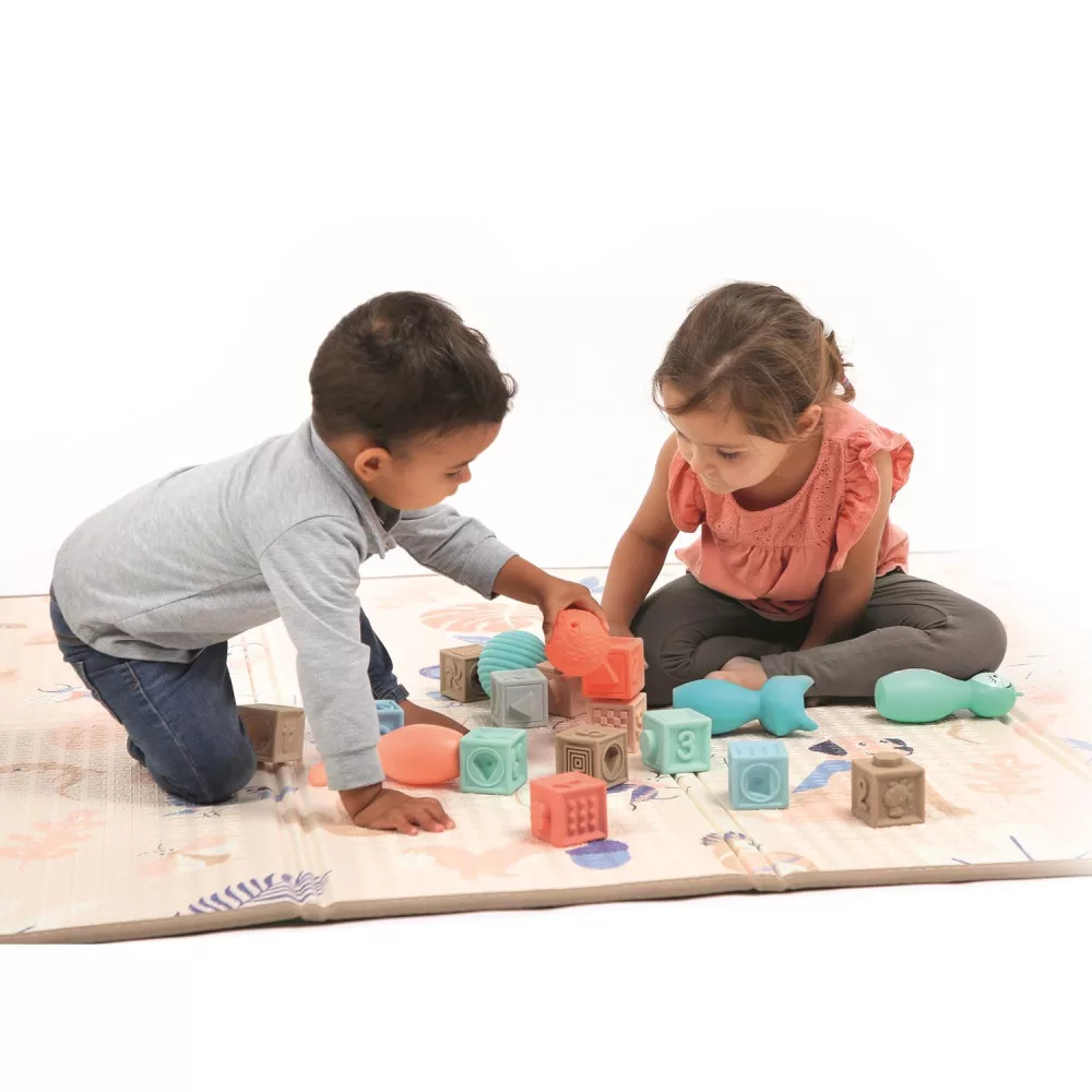 Ennek a kétoldalas játszószőnyegnek minden kisbabás családban ott a helye. Nagy méretének és puha anyagának köszönhetően megfelelő és biztonságos játékteret biztosít a gyermekek számra, tompítja az eséseket. Mindkét oldalán eltérő a mintája így azt kedvünkre váltogathatjuk. Az egyik oldal pasztell színű, állatokkal és növény mintákkal díszített, míg a másik oldala intenzívebb színárnyalatú és remek alapot biztosít egy erdei autós kiránduláshoz. Vastag anyaga lehetővé teszi, hogy akár alagutat is készítsünk belőle.