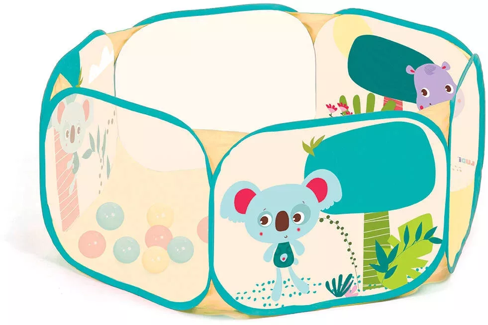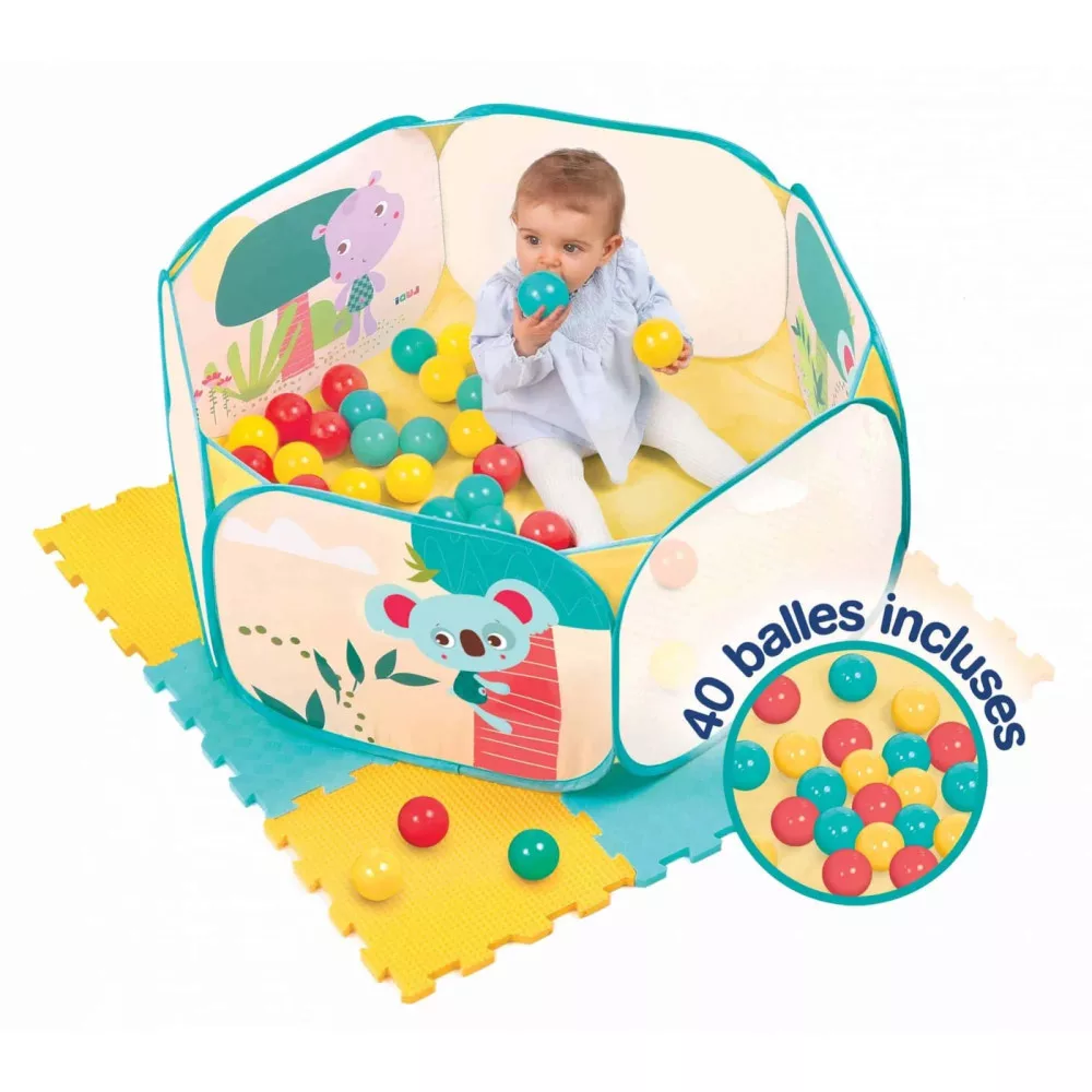 A játéktér ütéscsillapító puha habszivacs lapokkal készült, így biztosítja a baba biztonságát játék közben. A labdák mérete ideális a kis kezekhez, így a babád könnyen meg tudja fogni és szorítani őket.