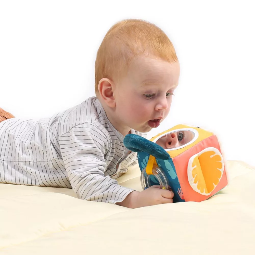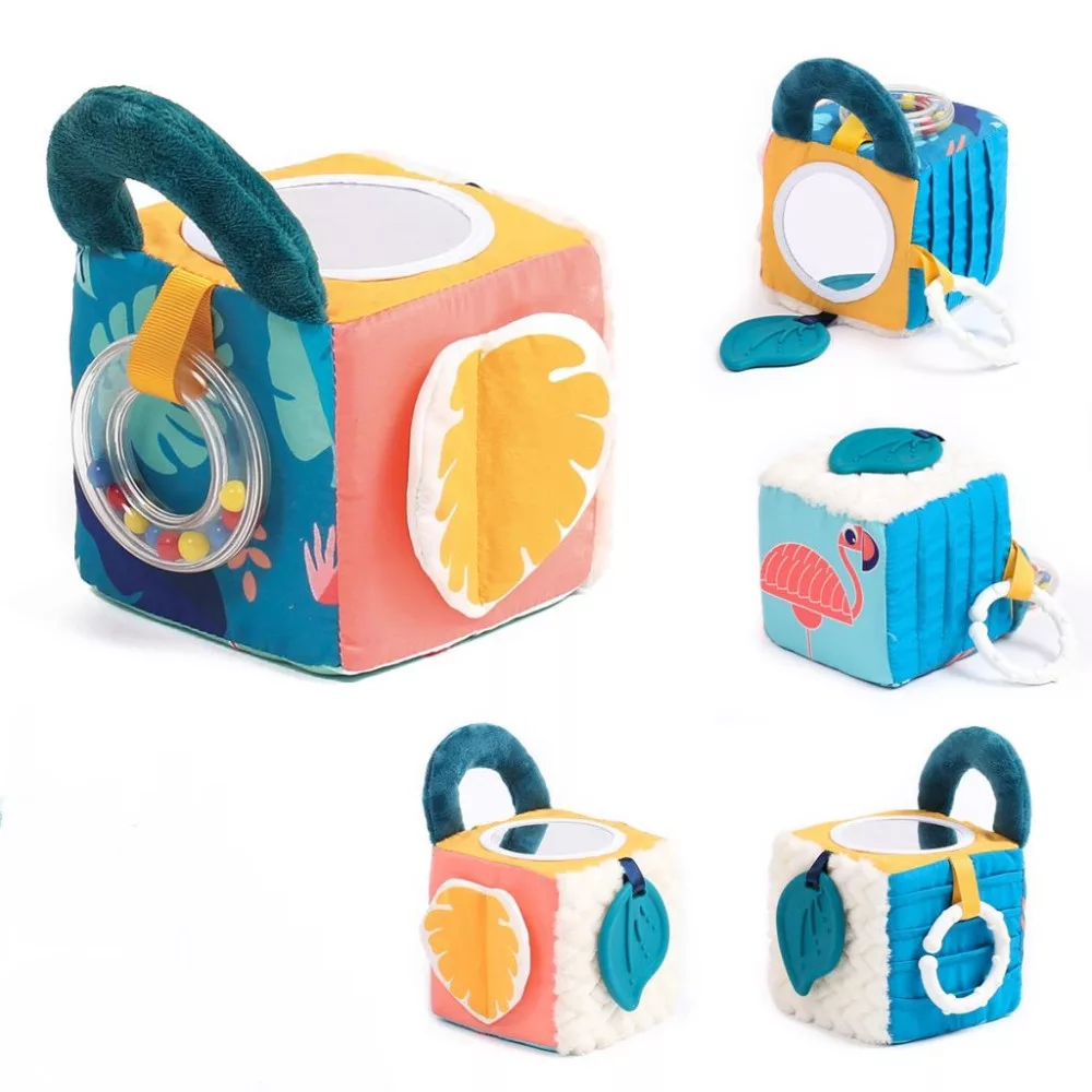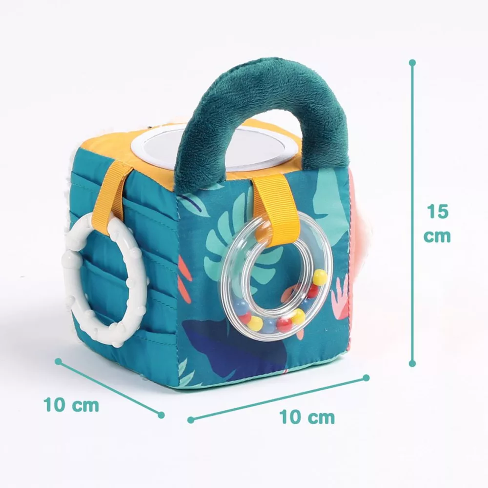 • Kiegészítők: A kockán találhattok egy színes golyókkal töltött csörgő karikát és egy tükrös oldalt is mely a babák kedvence lesz, illetve egy levél formájú szilikon rágóka is elhelyezésre került