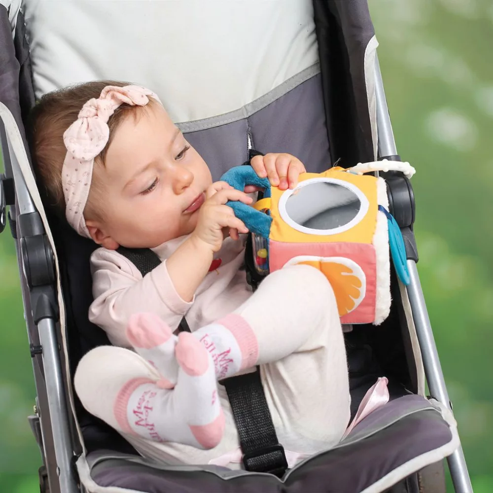 A kockához tartozik egy rugalmas gyűrű is, mely segítségével könnyen rögzíthetik az autóban, babakocsihoz vagy egy játszónyőnyegen.