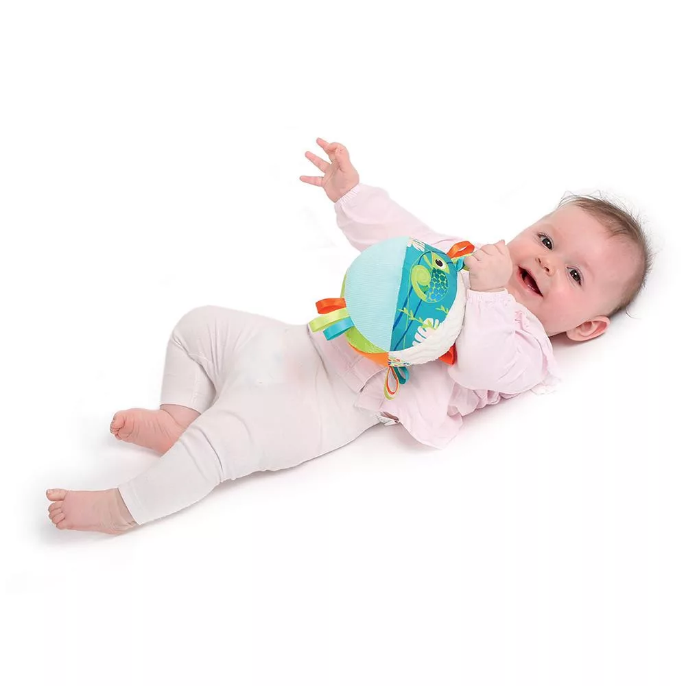 • Színes szalagok: A labdán színes szalagok lógnak, amelyeket a baba megragadhat és rágcsálhat.
