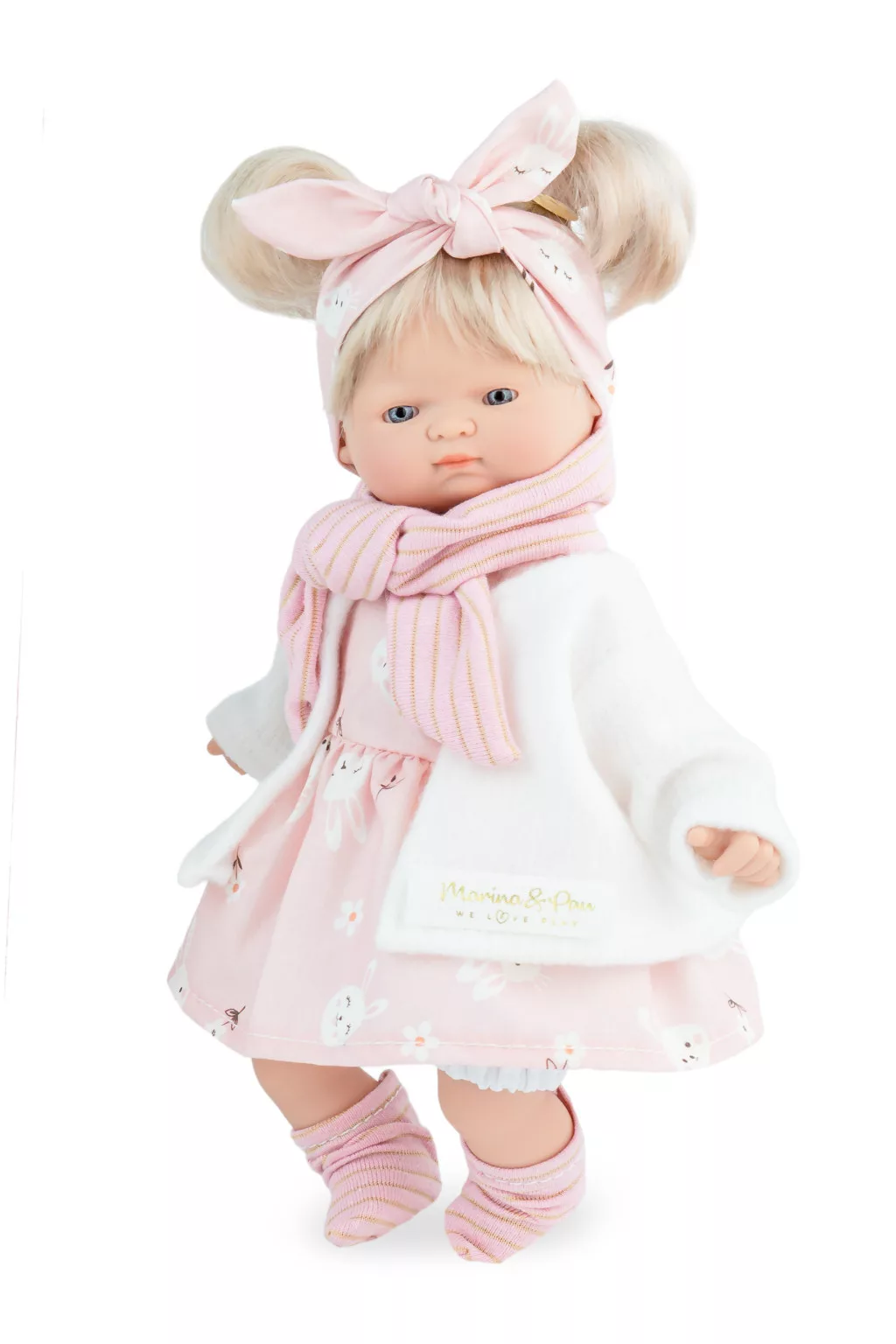 Ismerjétek meg ezt a tündéri,puha testű 26 cm-es világosbarna hajú kislányt, aki most nyuszis fejpántjában, rózsaszín ruhájában és kardigánjában varázsol el mindenkit! A kisnyuszikkal és virágokkal teli szoknyája még édesebbé teszi ezt a Marina&Pau babát.