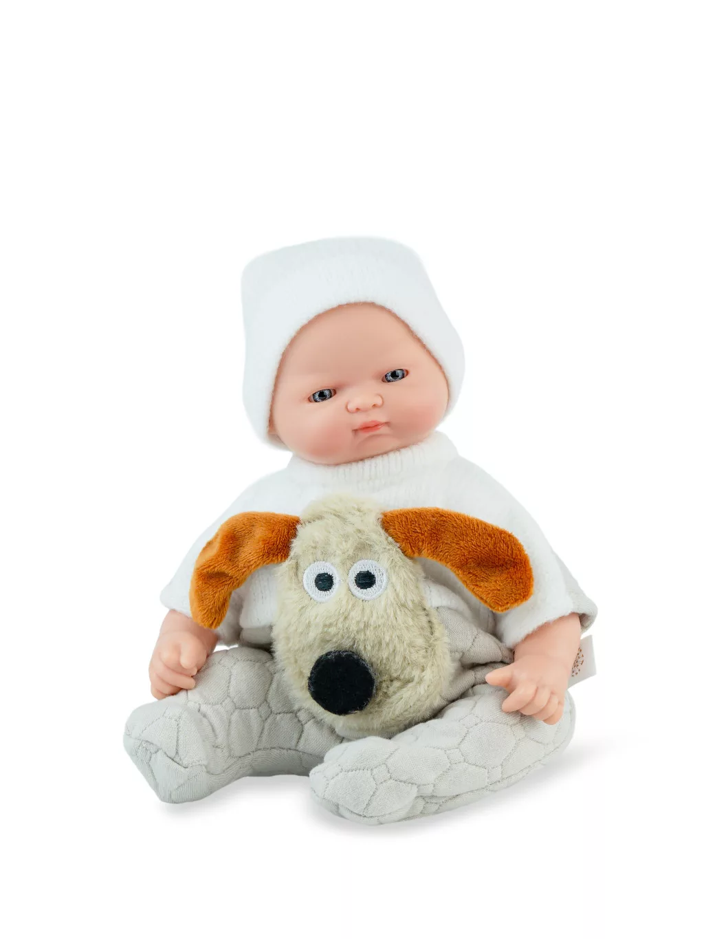 Ismerjétek meg ezt a tündéri,puha testű 26 cm-es kisfút, aki most fehér sapkában, édes kutyusos rugdalózóban várja, hogy valaki a kezébe vegye.