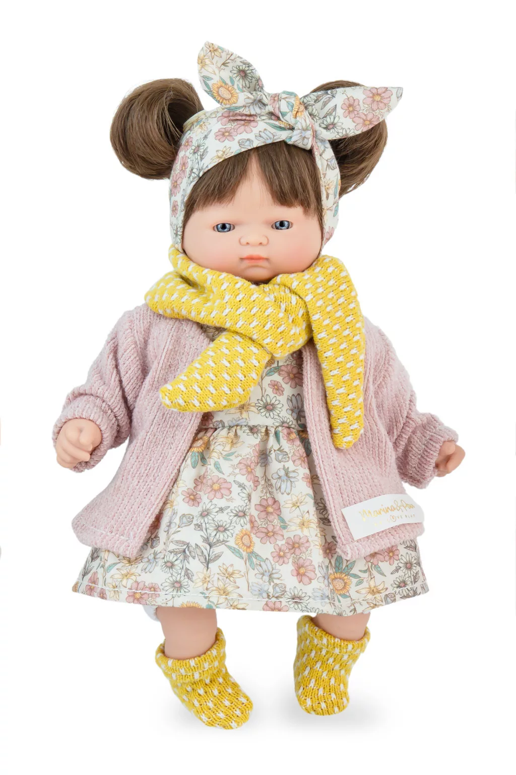 Ismerjétek meg ezt a tündéri,puha testű 26 cm-es barna hajú kislányt, aki most színes, vidá, virágos fejpántjában, ugyanolyan anyagú ruhájában és kardigánjában varázsol el mindenkit! A virágokkal teli szoknyája még édesebbé teszi ezt a Marina&Pau babát.