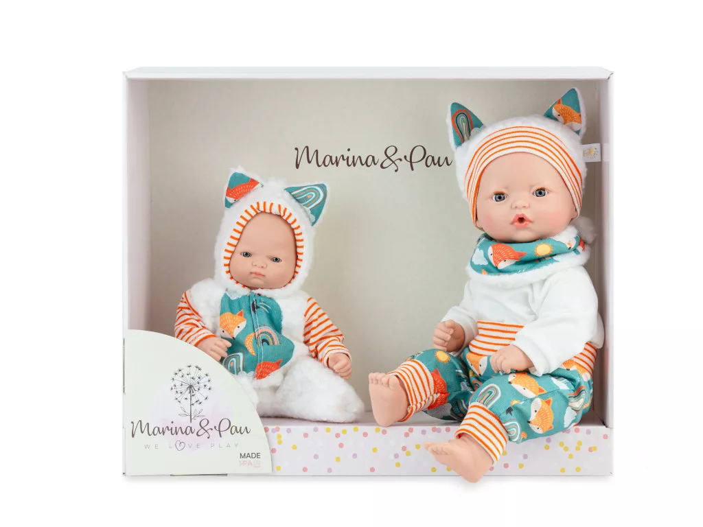 Két divatosan öltöztetett spanyol baba: 40 cm és 26 cm, a Marina & Pau gyártó egyedi ajánlata. Álomjátékok azoknak a gyerekeknek, akik szeretnek babázni, ringatni és öltözködni. A teljes egészében Spanyolországban készült babák puha hassal, könnyű, kézzel festett vinilből készült fejjel és végtagokkal rendelkeznek.