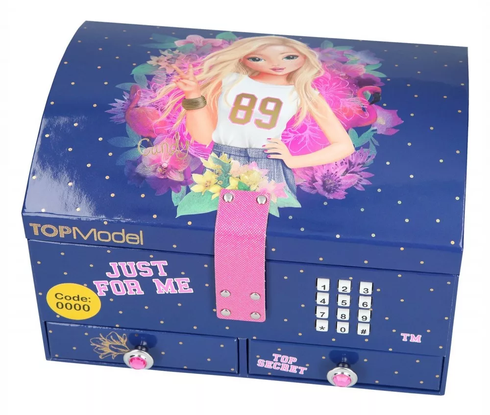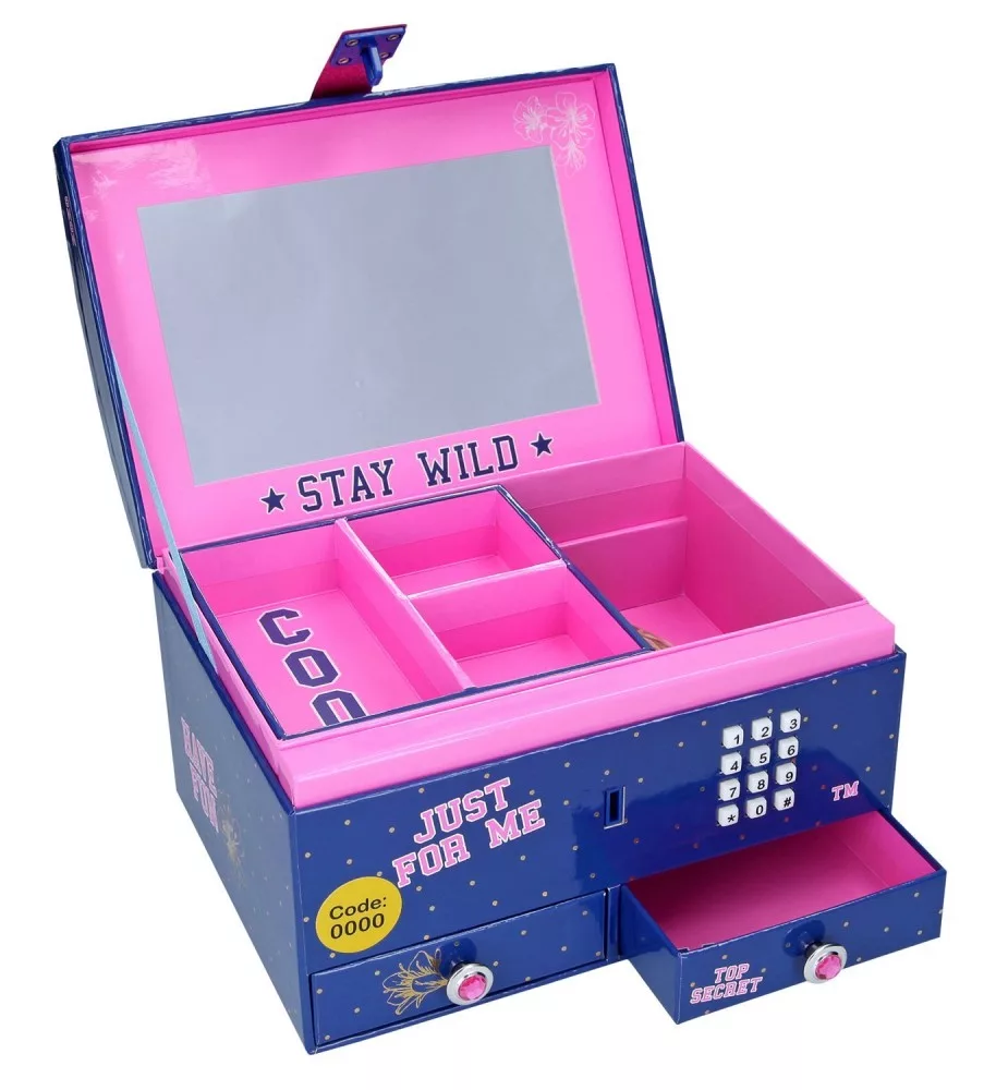 Titkos ékszer doboz, melyben a kincseidet egy számkód megadásával őrizheted. Ha a megfelelő kódot ütöd be, akkor kipattan a fedele és egy kedves dallamot játszik le. A kódot bármikor tudod módosítani. Az ékszerdoboz belseje gyönyörű, 4db  rekeszt és  2 fiókot tartalmaz, melyekben sok minden elfér.