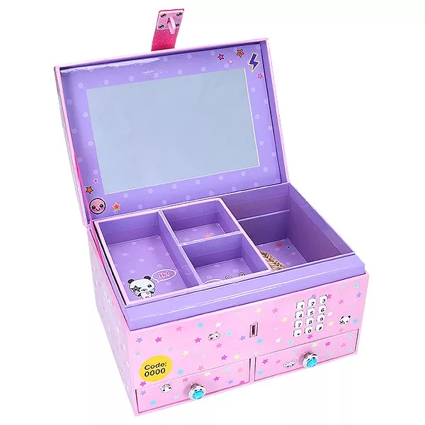 Titkos ékszer doboz, melyben a kincseidet egy számkód megadásával őrizheted. Ha a megfelelő kódot ütöd be, akkor kipattan a fedele és egy kedves dallamot játszik le. A kódot bármikor tudod módosítani. Az ékszerdoboz belseje gyönyörű, 4db  rekeszt és  2 fiókot tartalmaz, melyekben sok minden elfér.