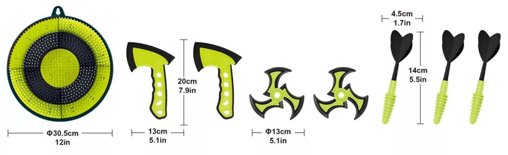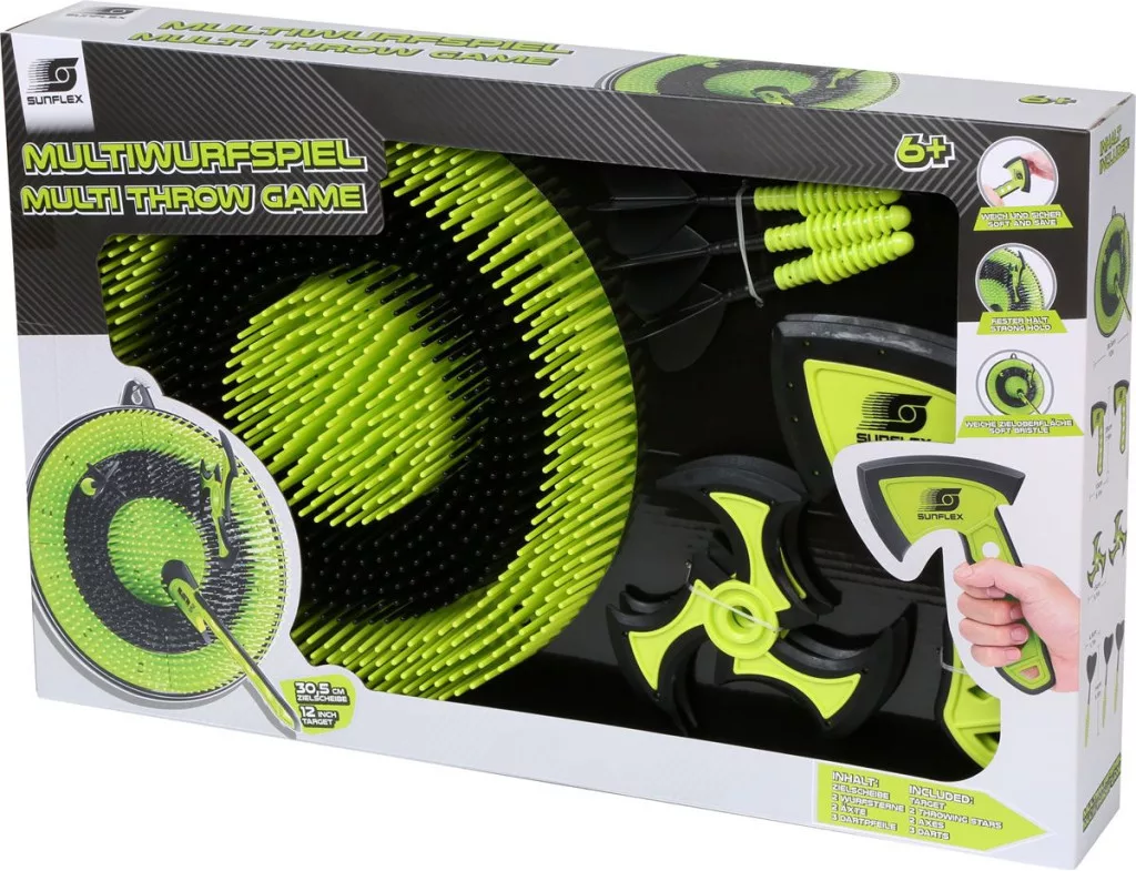 Tapasztald meg a céldobás nyújtotta szórakozást a sunflex új játékkészletével! A többrészes ügyességi játék céltáblája 30 cm átmérőjű, és kifejezetten a készletben található lövedékek használatára lett tervezve, mint például: kalapácsvetés, darts, dobócsillag.