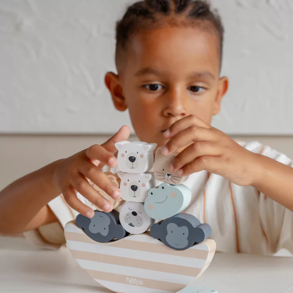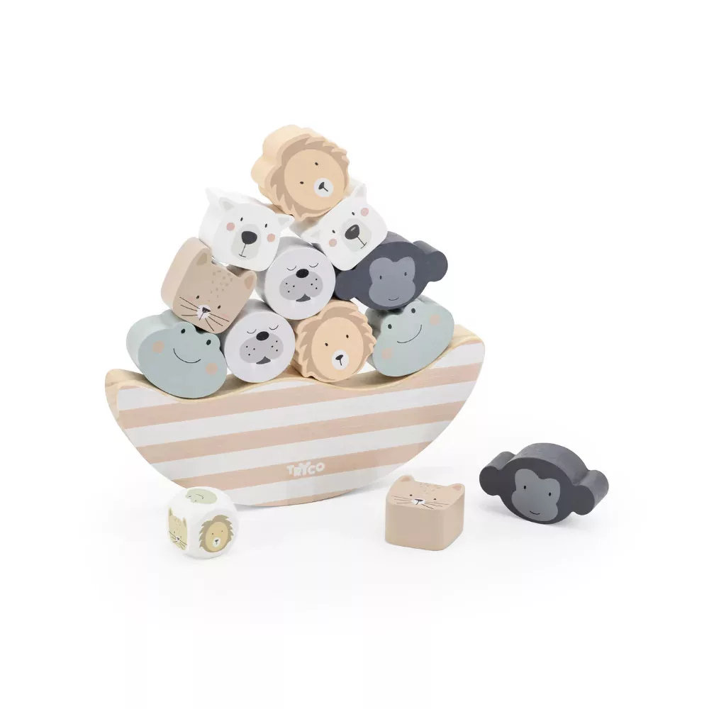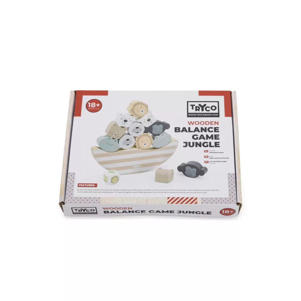 Tartsd egyensúlyban! Ez a legfontosabb feladat ebben a minőségi és igényesen megtervezett fából készült Tryco egyensúlyozó játékban. Ismerkedj meg a dzsungel állataival, miközben az imbolygó hajóra teszed őket, s közben észrevétlenül fejlődhet a szem-kéz koordináció, a türelem, a kudarctűrés és a finommotorika.