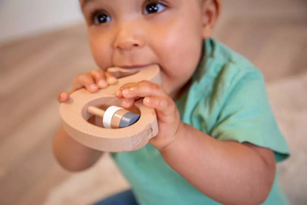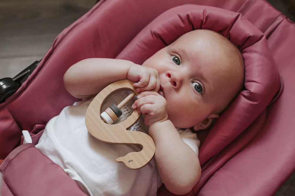 Ez az édes kis fa hattyú, minden kislány kedvence lesz. Kialakításának köszönhetően, gyermekünk könnyen megtudja markolni, a gyűrűk kellemes csörgő hangot adnak ki játék közben. Ajánljuk mindeniken aki szereti a temészetes anyagokból készült játékokat. Minden éle le van kerekítve így kisbabánk biztonságosan játszhat vele.