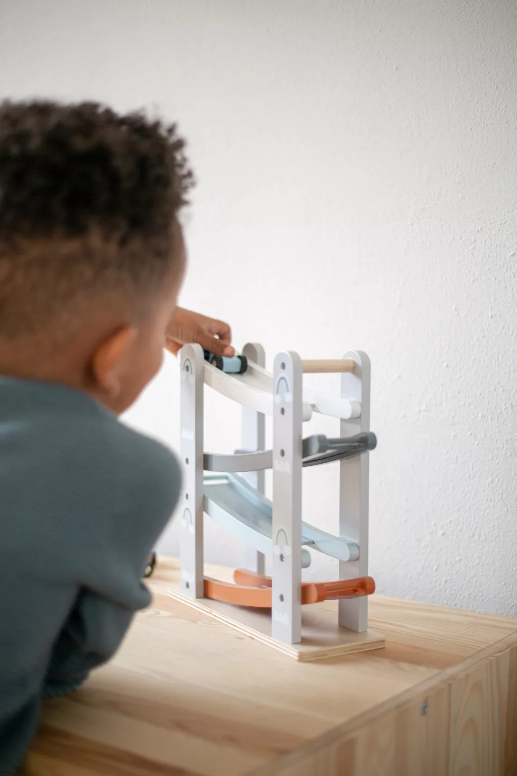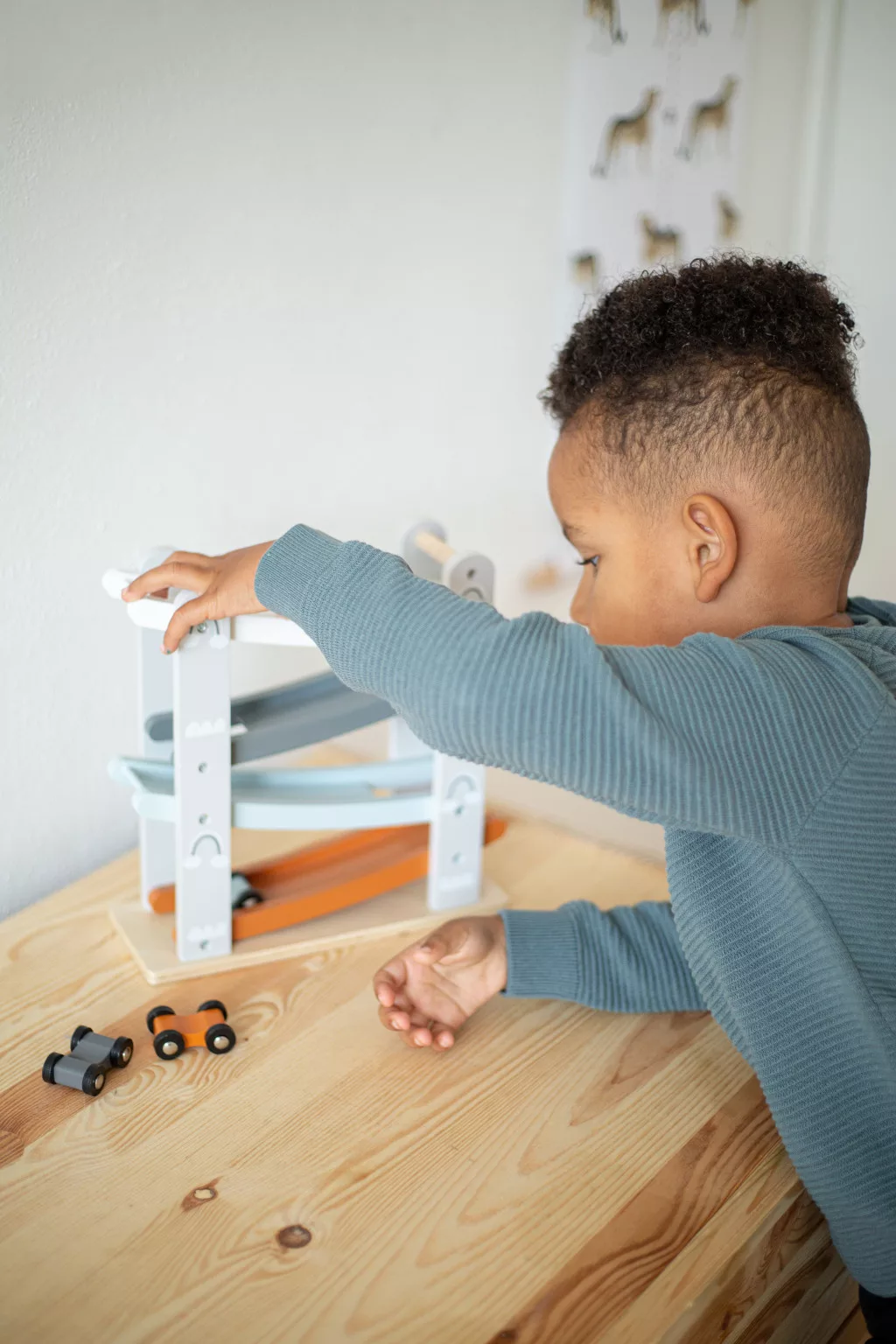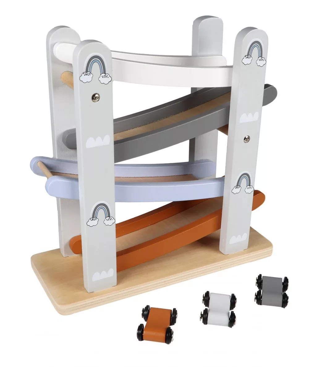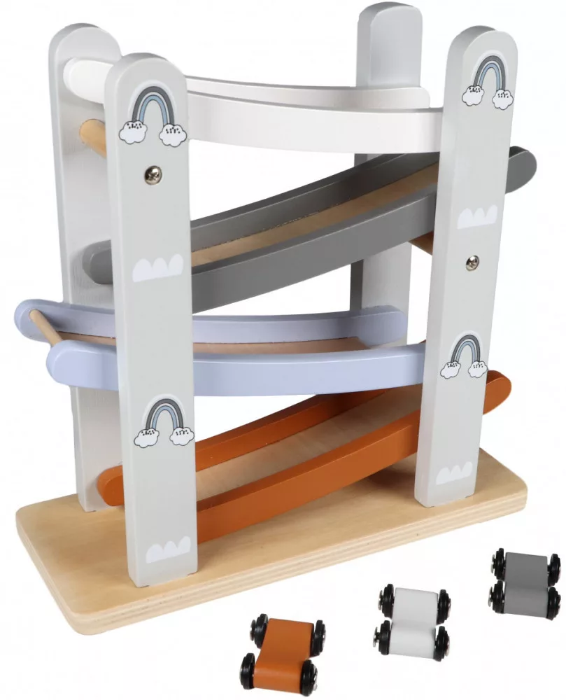 Engedd, hogy gyermeked elmerüljön a száguldó autók izgalmas világában ezzel a strapabíró, de mégis gyönyörű fa versenypályával, amely nemcsak szórakoztat, de fejleszti a finommotorikus készségeket is. A cikcakkban haladó autók mellett a szivárványminta és a modern színek garantáltan lekötik a kicsik figyelmét.