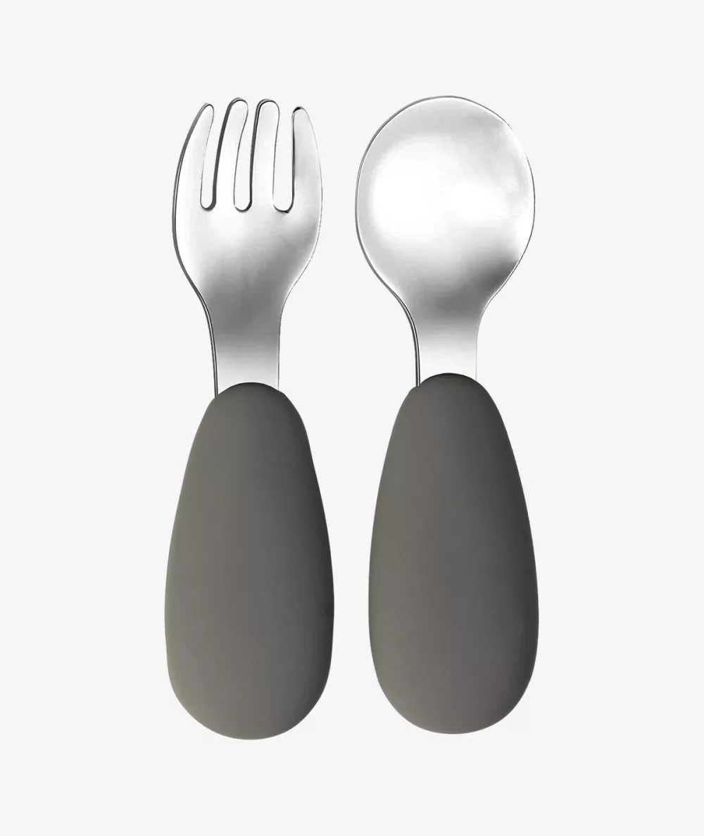 Tryco - rozsdamentes acél evőeszköz készlet sötétszürke kanál és villa. Megtanítja a gyermeket önállóan enni. Méretének köszönhetően ideális a kis kezeknek. Praktikus és kényelmes.