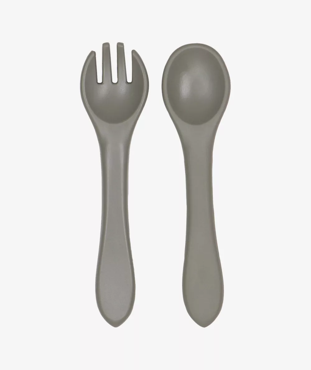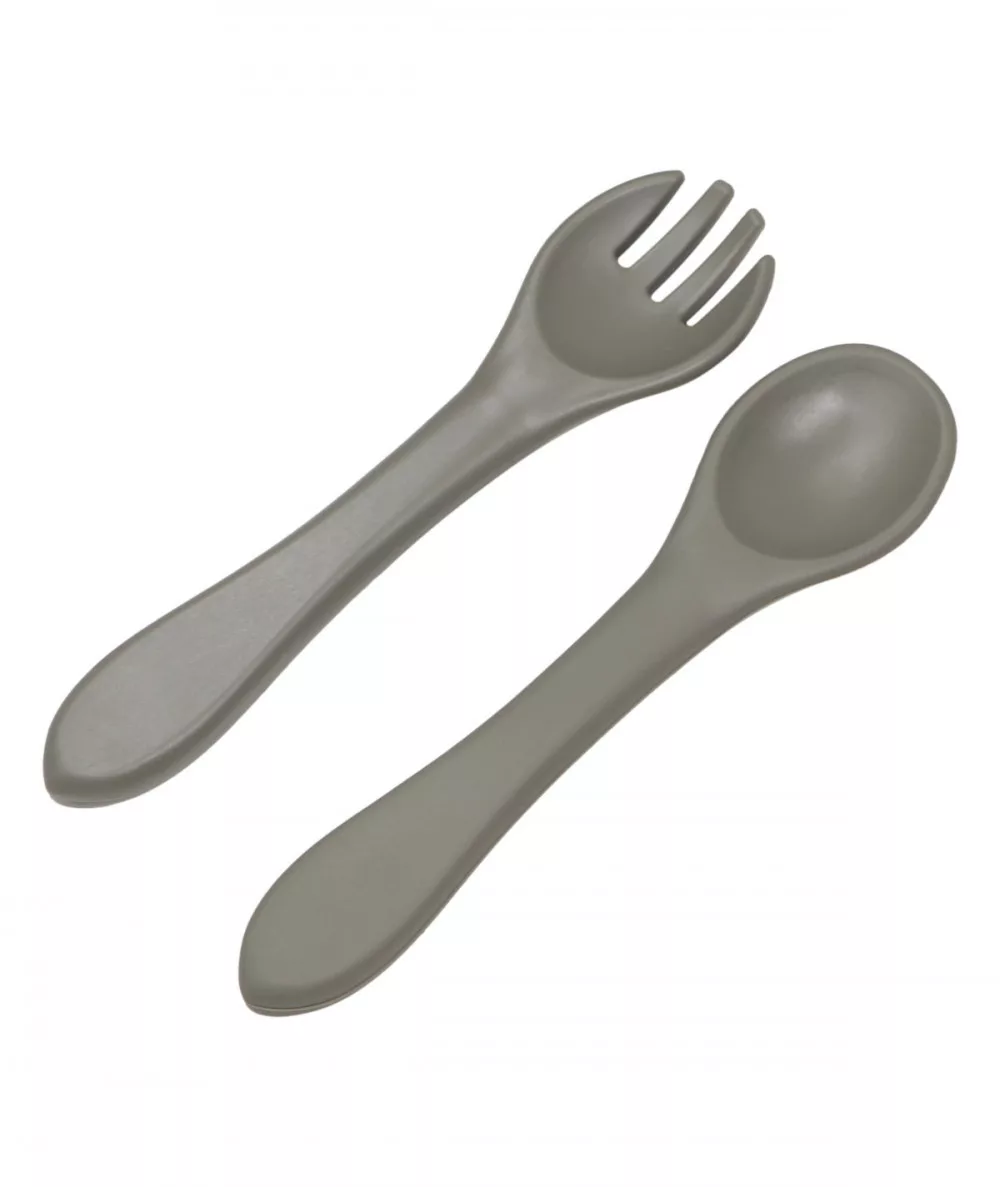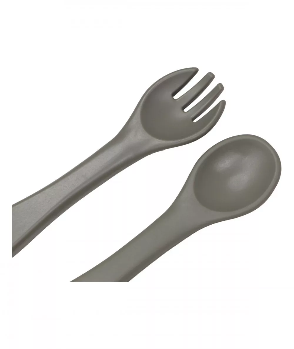 Tryco - szilikon evőeszköz készlet olivaszürke kanál és villa. Segítségükkel gyermekünk kényelmesen és biztonságosan ismerkedhet meg az evőeszközök használatával. Tapintása kellemes és anyagának köszönhetően nem csúszik ki könnyen gyermekünk kezéből. Lekerekített feje és vékony nyele kiválóan alkalmazkodik kisbabánk igényeihez.