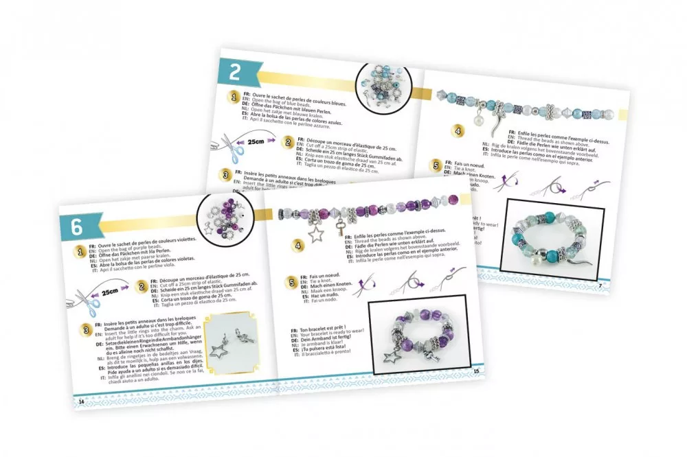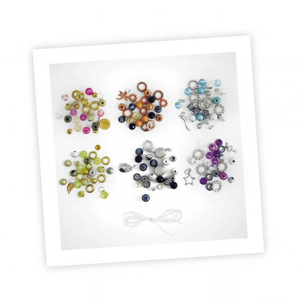 A készlet tartalma: több mint 135 gyöngy, 11 charm, 11 fém karika, rugalmas fonál, színesen illusztrált használati utasítás.