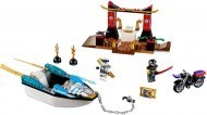 LEGO® 10755 - LEGO Juniors Zane nindzsahajós üldözése. Ugorj be Zane csónakjába, és vegyél részt vele a hajszában: a cél, hogy ti szerezzétek meg a maszkhoz elvezető térképet! Száguldj a templom felé, közben azonban figyelj, nem közelít-e Chopper Maroon, Garmadon egyik fia a motorján. Itt is van, és elhúz melletted! Állítsd meg a csónakot a dokknál, és száguldj fel a lépcsőn, be a templomba, de vigyázz a csapdákkal! Ugorj félre a forgó kések és kígyók elől, aztán a csónakon lévő horog segítségével szerezd meg a térképet! Sikerül még Chopper Maroon előtt célba érned?