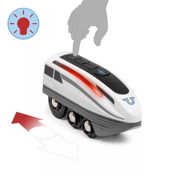 Növelje a sebességet a 36003 Turbo Train segítségével. Egyszerűen nyomja meg a nagy turbógombot, és ez az akkumulátorral működő játékvonat megduplázza sebességét, így a BRIO World leggyorsabb vonata lesz. A turbólökés 5 másodpercig tart, és a maximális sebesség mellett a motor oldalán lévő fehér lámpák hideg kékre váltanak. Ez a futurisztikus kialakítású vonat egy utasszállító kocsit is tartalmaz, amely elegendő hellyel rendelkezik ahhoz, hogy egy szerencsés utas élvezhesse a felejthetetlen utazást.
