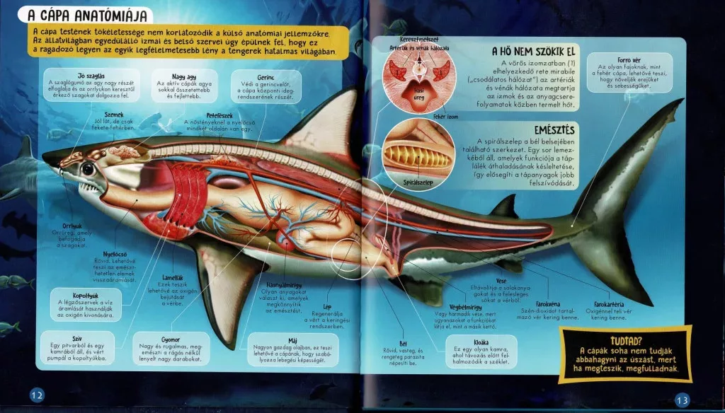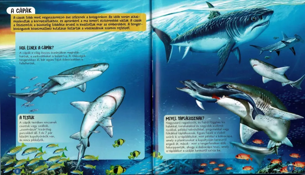 A Nézd meg belülről - Cápák könyv egy izgalmas ismeretterjesztő kiadvány, amely a tenger mélyére kalauzolja az olvasókat, hogy felfedezzék a cápák lenyűgöző világát. Több mint 400 millió éve uralják az óceánokat, és számtalan formában, méretben és viselkedéssel alkalmazkodtak környezetükhöz.