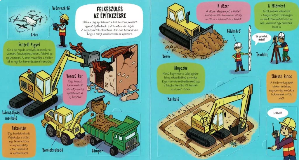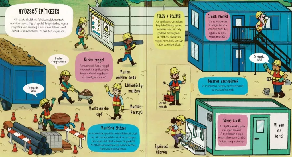 A könyv minden oldalán újabb és újabb részletek, érdekes feladatok és meglepetések várnak, és több mint 30 felnyitható ablak rejt izgalmas információkat, melyek segítségével a gyerekek megtudhatják, hogyan épül fel egy ház alapja, miként dolgoznak a gépek és mit csinál egy építőmunkás a munka minden egyes szakaszában.
