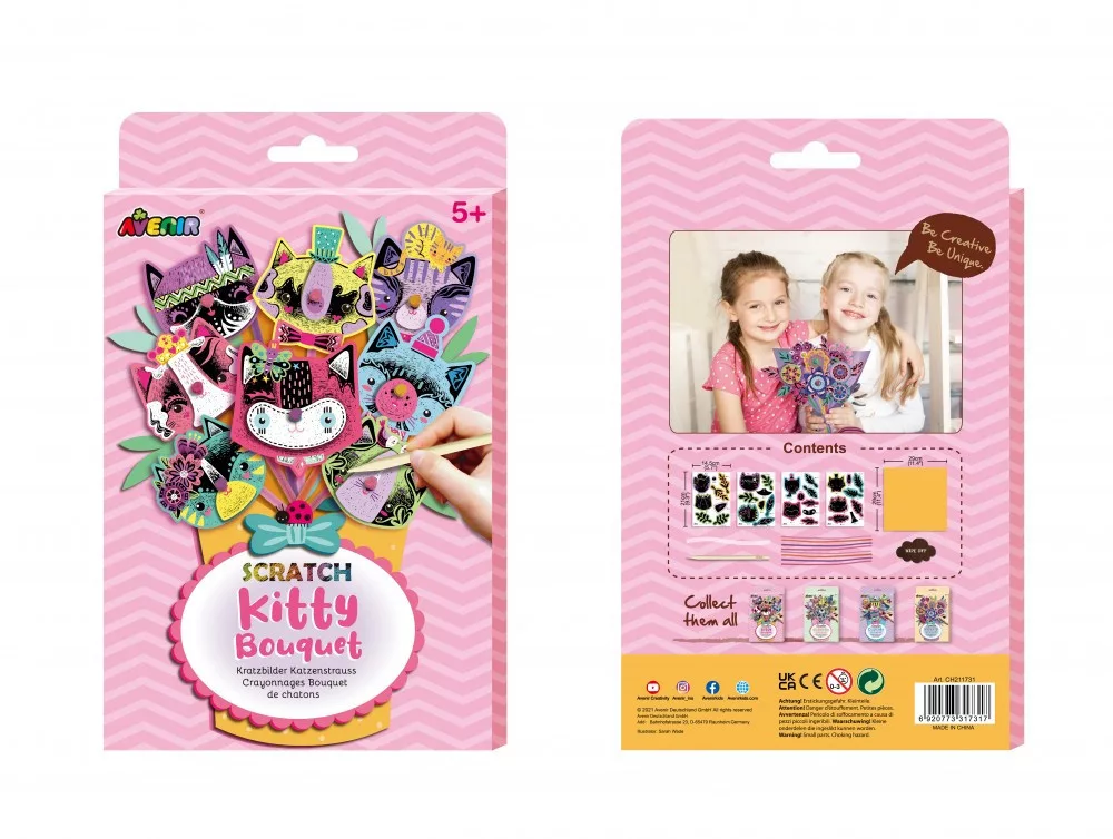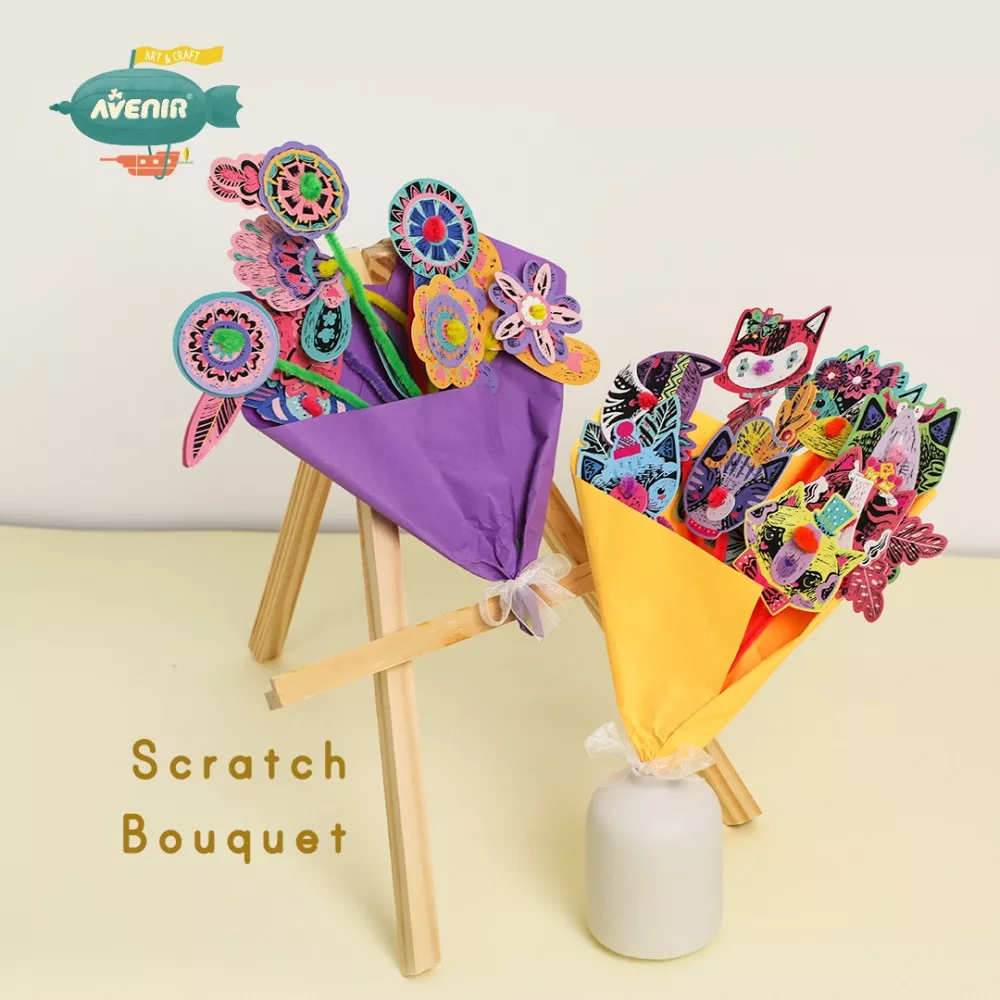 A készletben karcolható és zsenília rudakra rögzíthető kis képeket találhatsz, melyeket egy nagy virágycsokorba kell összekötné és egy szép papírba csomagolni.
