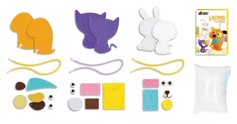 A gyerekek imádni fogják a plüssállatokat melyeket maguk alkotnak az Aveir My First Lacing Kit segítségével. Könnyű összefűzni az előre kilyukasztott darabokat a mellékelt fűzőkkel, majd hozzáadni a tölteléket, hogy egy imádnivaló állatát készítsetek.