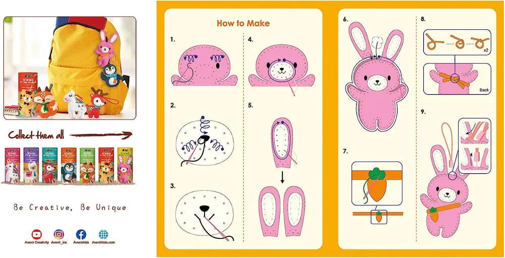 Készítsd el saját nyuszis kulcstartódat az Avenir varrható plüss készletével. Az egyszerű varrási utasításokat követve könnyedén megvarrhatod ezt az aranyos kis játékot és a tartozék zsínór segítségével bárhová felakaszthatod, például a kulcstartódra, a táskádra, a tolltartódra vagy dekorációként is használhatod a szobádban.