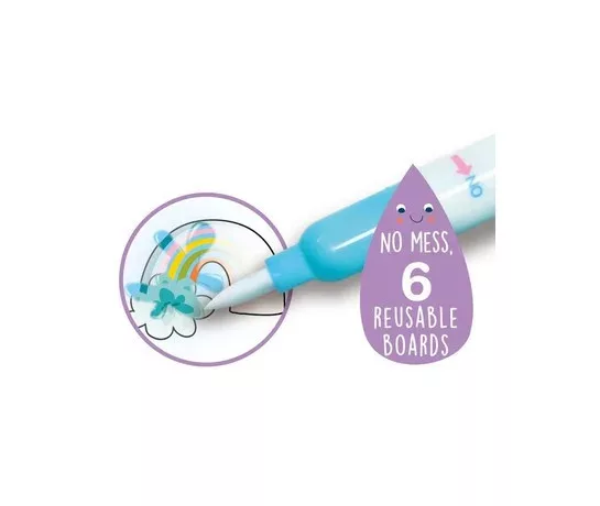 Színezd ki a fehér képeket a vizes ecset segítségével, mely a könyv spirálfűzéses oldalában található. A játékhoz nem kell festéket használnod! A kép amikor megszárad, visszafehéredik így újra és újra kiszínezheted a "varázstolladdal".