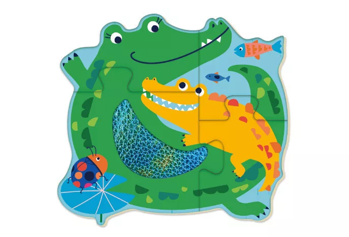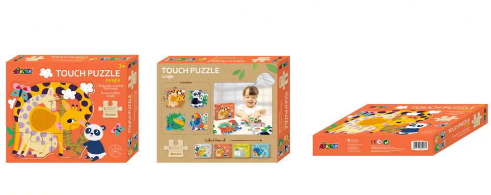 Minden dobozban 4 vadon élő állat képe található, melyek mindegyike 4 darabból rakható össze. A könnyű, fából készült elemek texturált felületeket tartalmaznak, hogy a kicsik tapintását is fejlessze, miközben a kirakóval játszanak.