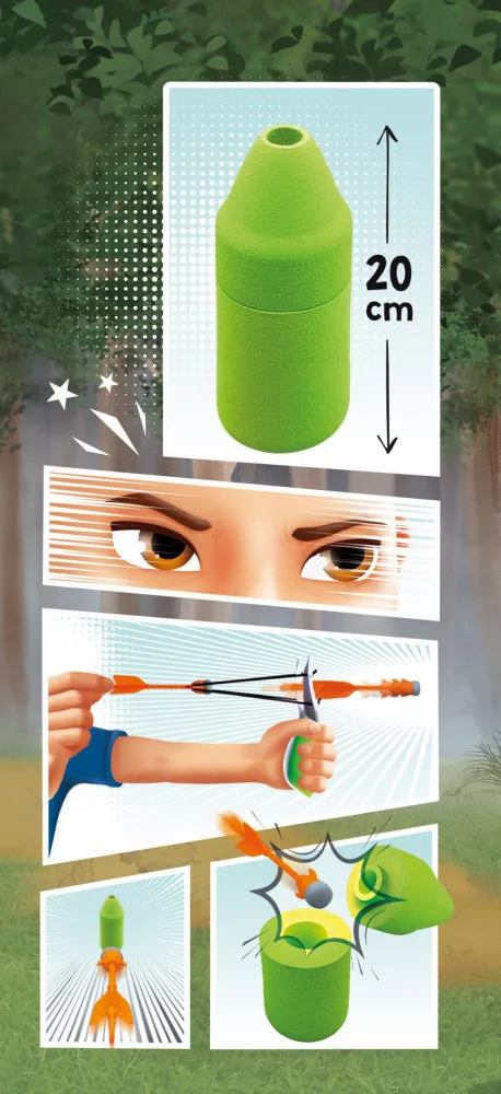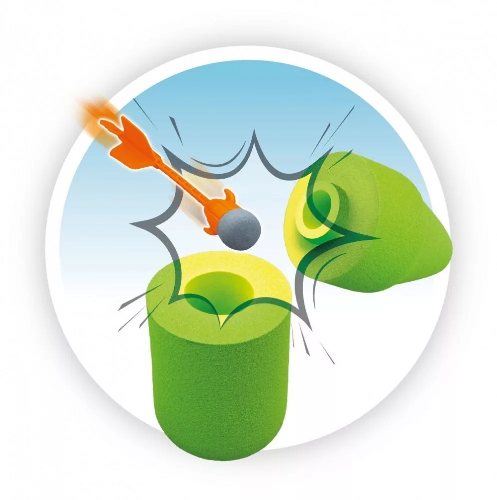 A csomagban található nyilak segítségével egy előre beállított habszivacs palackot (20 cm magas) is megcélozhatsz, amely ha ügyes vagy, ketté válik, amikor eltalálod!
