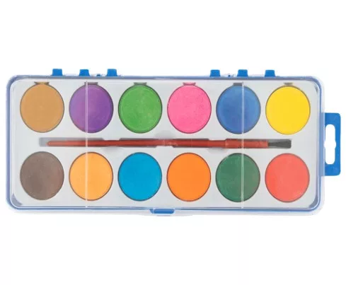 Vízfesték paletta 12 féle színnel és ecsettel, visszazárható műanyag fedéllel.