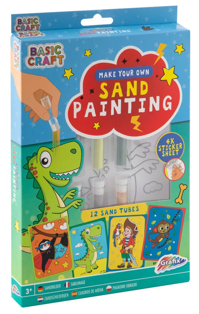 Ez a készlet 12 cső homokot tartalmaz különböző színekben és 4 matricás lapot.