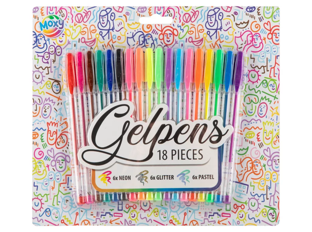 18 db-os színes zseléstoll készlet, melyben neon, csillogós és pasztell színek is megtalálhatók.