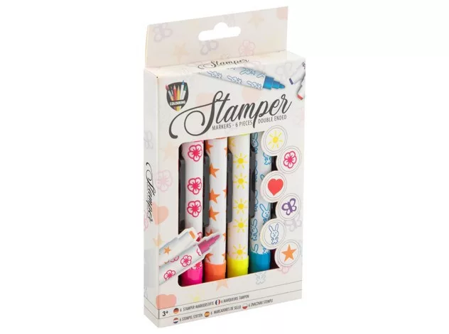 6 db bélyegzőmarker 6 különböző színben: rózsaszín, piros, narancs, sárga, kék és lila. A bélyegzők mintái: nap, virág, szív, pillangó, nyúl és csillag.