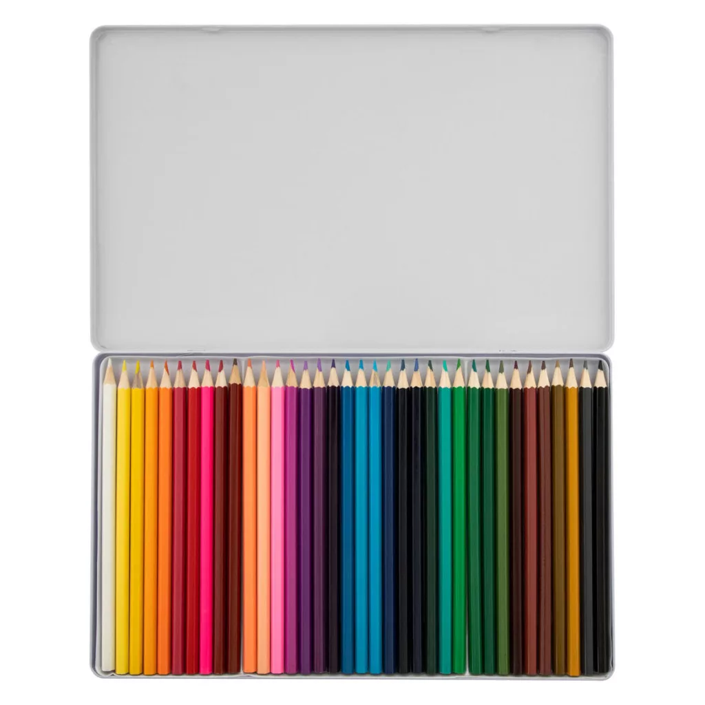 Fém tárolódobozba helyezett 36 db-os színes ceruza készlet, amely élénk és pasztell színeket is tartalmaz.