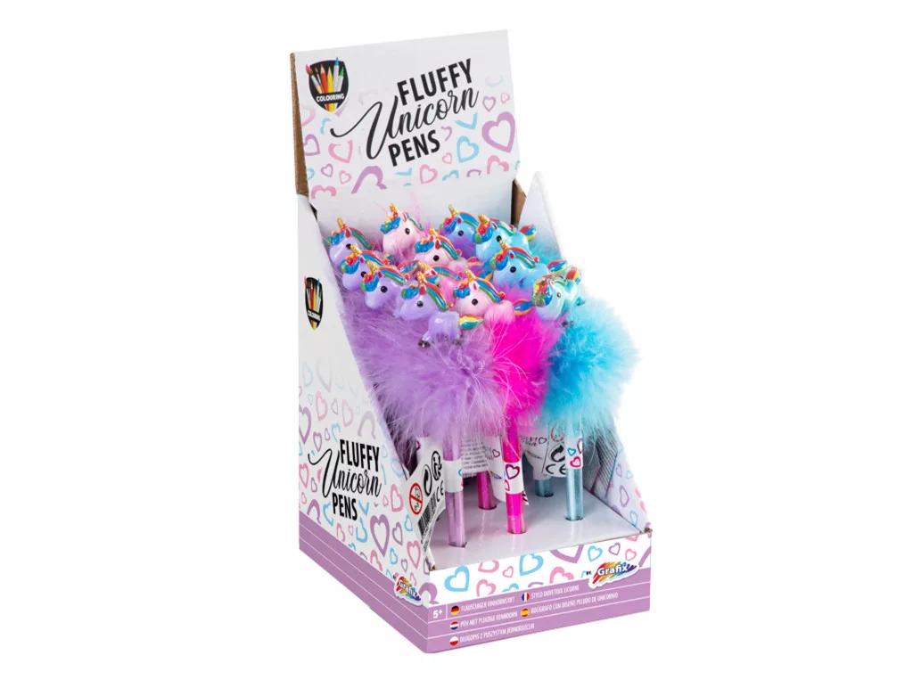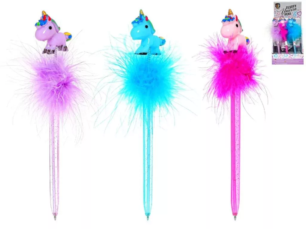 Vidám színes toll unikornissal a tetején, 3 féle színben. A figura egy bolyhos dísszel együtt került a toll végére.