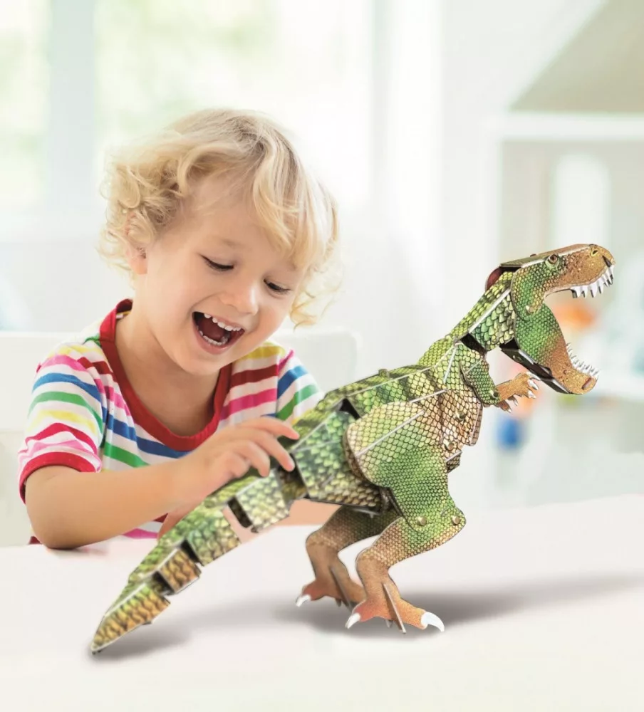 Készíts egy hatalmas T-Rex figurát a dobozban található vastag karton darabok és jancsiszögek felhasználásával! Építsd meg ezt az 50 cm hosszú fantasztikus dinoszauruszt és játsz kedvedre vagy dekoráld vele szobádat! 6+ éves kortól ajánlott kreatív játék.