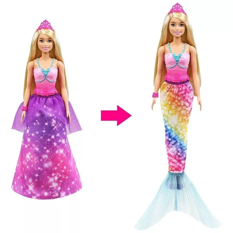 Neked melyik a kedvenced, Barbie vagy sellő Barbie? Ken vagy sellő Ken? Nem kell választanod, mert ezekkel a készletekkel a kettő egyszerre lehet a tied. A Barbie Dreamtopia babák fantasztikus átváltoztatáson képesek keresztülmenni, így a játék még sokszínűbbek velük! Ken baba és Barbie baba néhány mozdulattal hercegből és hercegnőből hablegénnyé és hableánnyá változhat. Mindkét baba igazán színpompás külsőt kapott. Barbie hercegnős szoknyájából és Ken hercegi köpenyéből készítheted el vibrálóan szívárványos uszonyaikat. Készen állsz az indulásra Dreamtopiába? Akkor indulhat a játék! A sellőpár átalakulását az elbűvölő kiegészítők teszik még szórakoztatóbbá.